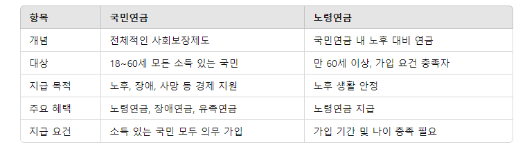 - 노령연금은 국민연금의 한 부분으로, 노후 생계비에 초점을 둔 연금입니다.