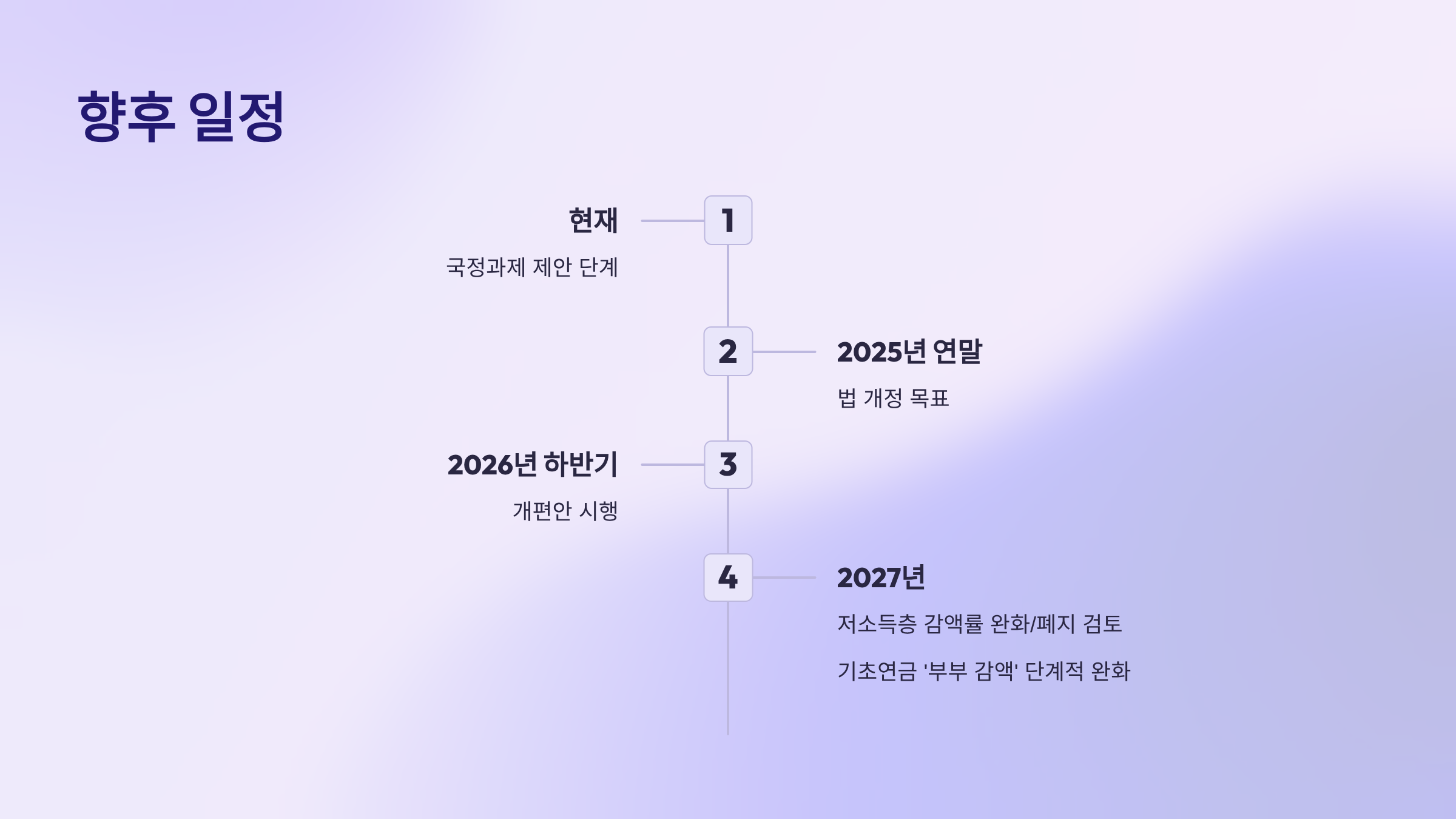 현재는 국정과제 제안 단계입니다. 복지부·관계부처·국회 협의를 거쳐 2025년 연말 법 개정을 목표로 하고 있으며, 2026년 하반기부터 실제 시행될 예정입니다.