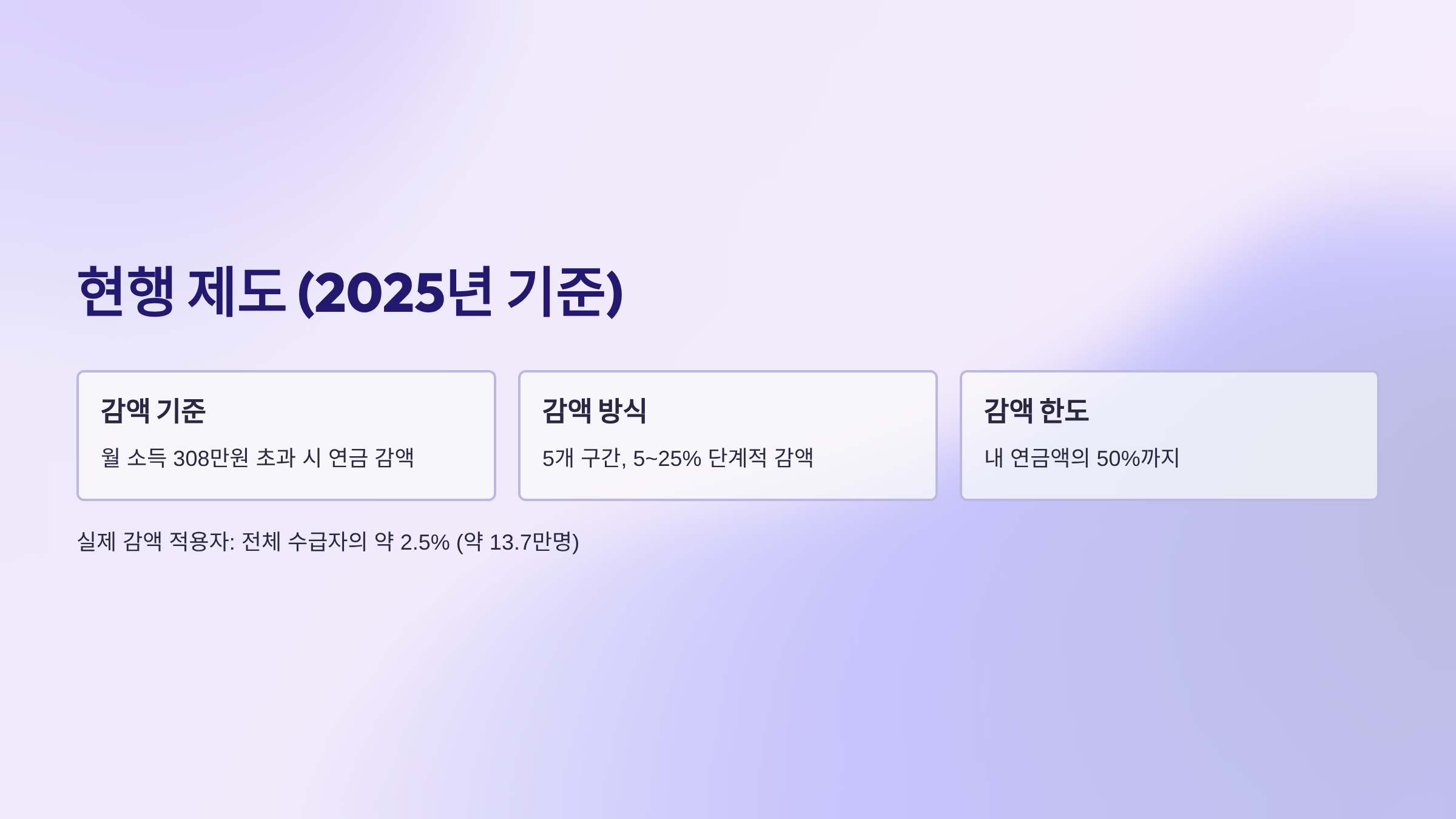 감액 대상 소득은 근로·사업 소득 중심이며, 이자·배당·다른 연금소득 등은 감액에서 제외됩니다. 실제 감액 적용자는 전체 수급자의 약 2.5% 수준(약 13만7천명)으로, 제도는 존재하지만 체감층은 많지 않습니다. 그럼에도 “일하면 연금이 줄어든다”는 인식이 고령층 노동 참여에 심리적 장벽으로 작용해 왔습니다.