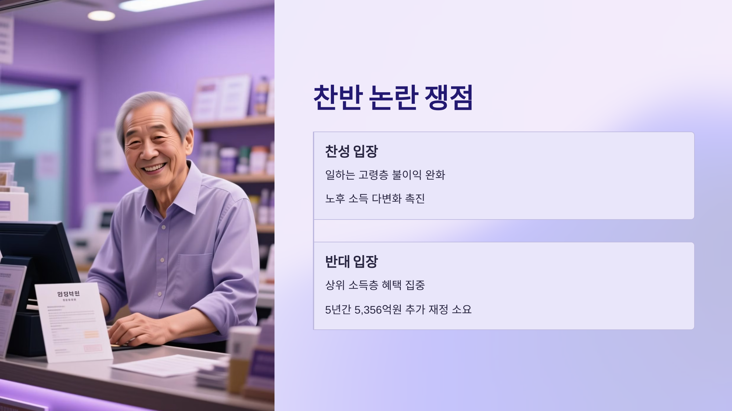 찬성 입장은 “일한다고 연금을 깎는 건 부당하다”는 점을 강조합니다. 감액 부담이 사라지면 고령층의 재취업·창업 참여가 늘고, 노후 소득 다변화로 생활 안정성이 커질 수 있습니다. 반대 입장은 “상위 소득층에 혜택이 집중된다”는 우려를 제기합니다.