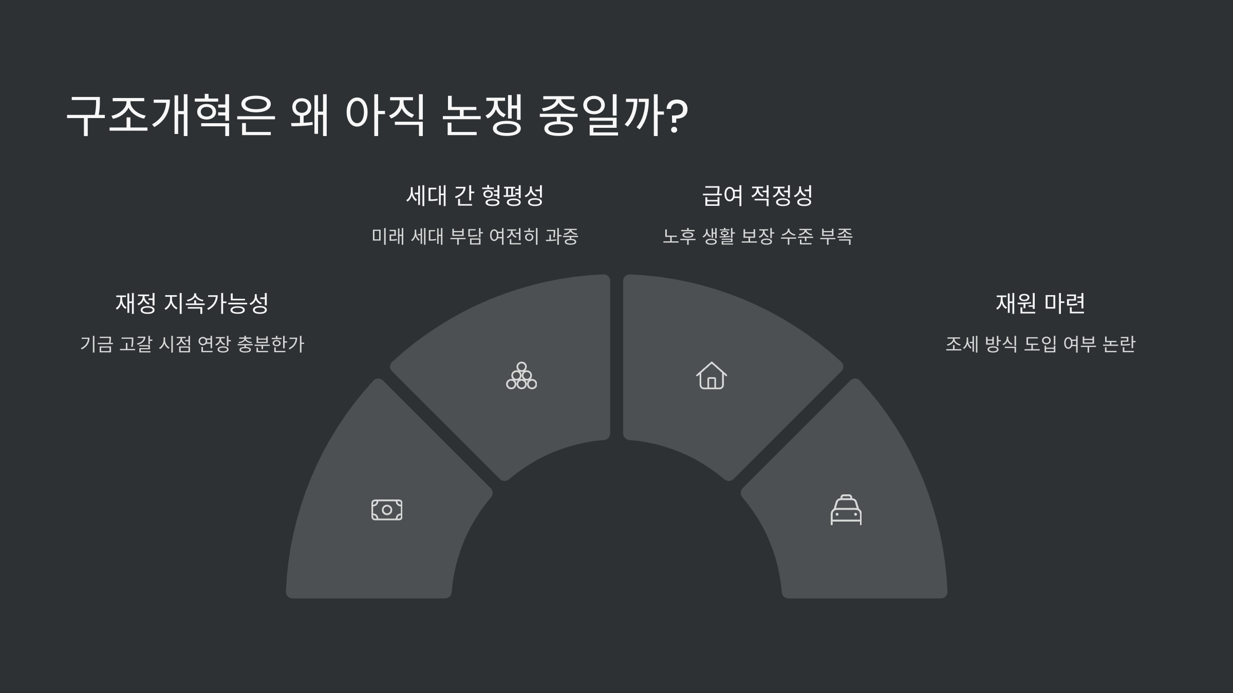 이번에 통과된 국민연금 개혁은 ‘모수개혁’이에요. 즉, 보험료율(내는 돈)과 소득대체율(받는 돈) 같은 수치만 조정하는 방식이죠. 하지만 제도의 뿌리까지 손보는 ‘구조개혁’은 아직 진행되지 않았고, 여기서 큰 쟁점이 이어지고 있어요.