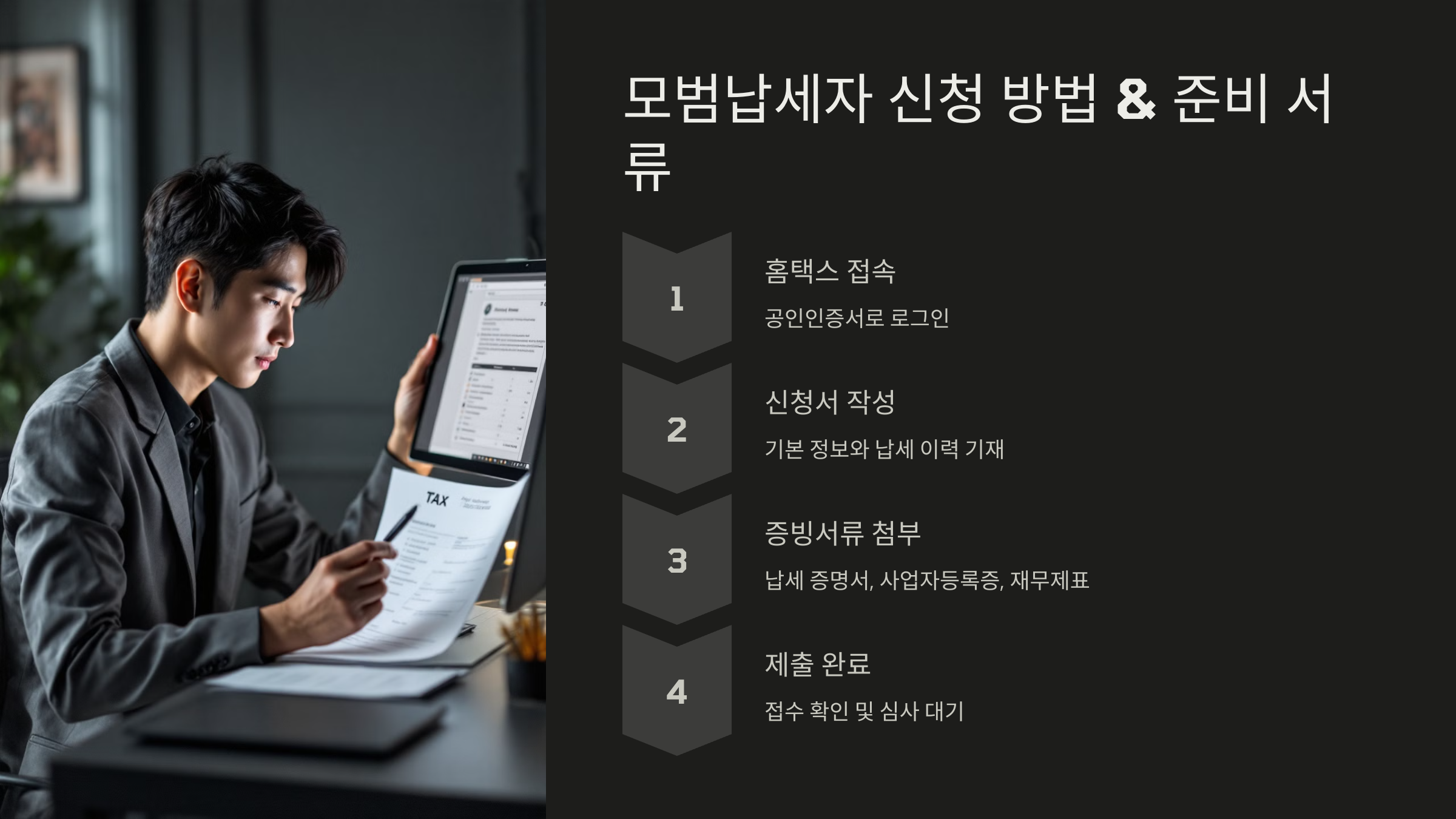 모범납세자로 선정되기까지 여러 단계의 심사 과정을 거치게 돼요. 이제 다음 섹션에서는 직접 신청하는 방법과 준비해야 할 서류를 알아볼까요? 😊