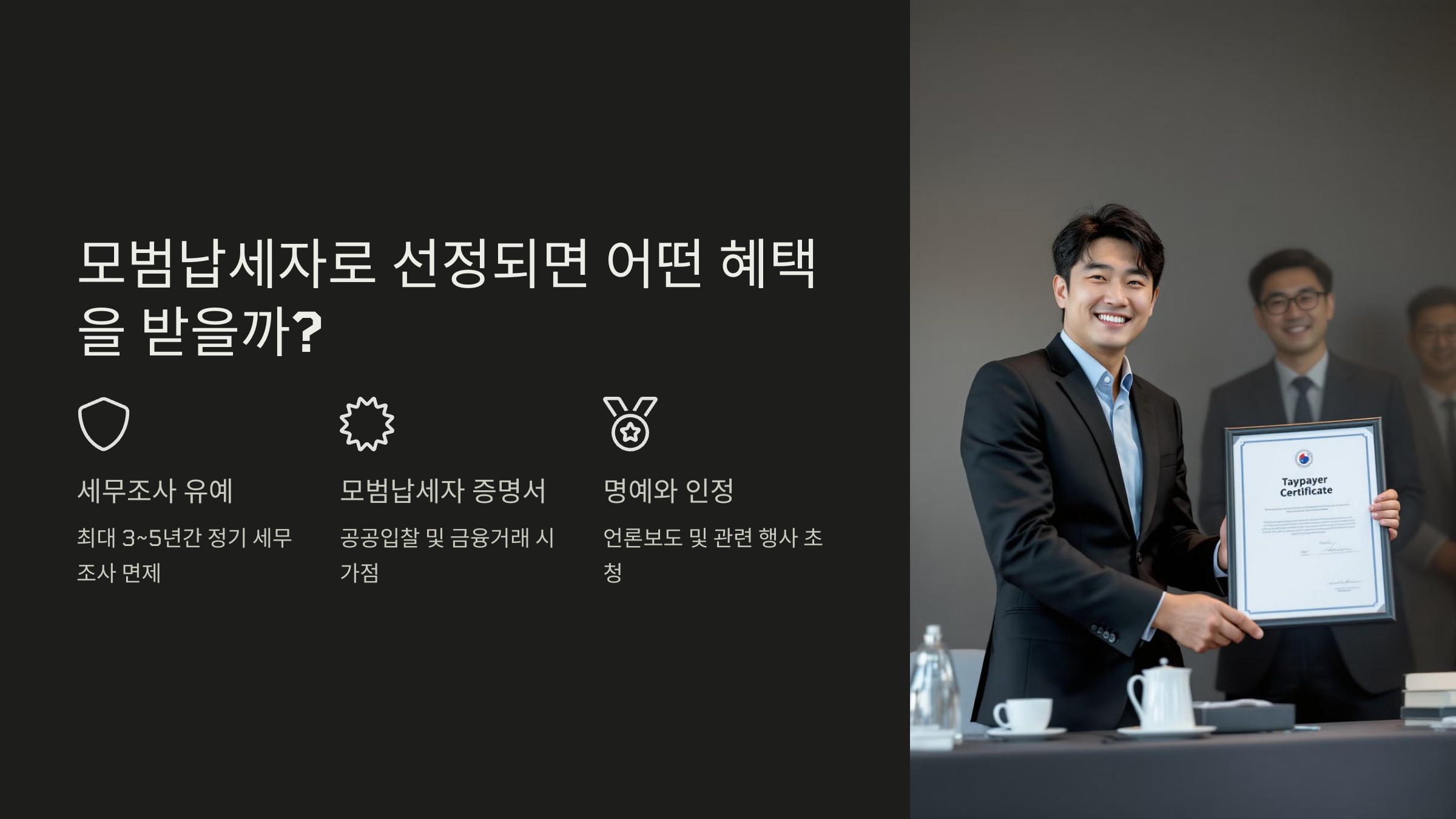 모범납세자는 일정 기간 동안 세무조사가 면제되거나 유예될 수 있어요. 또한 일부 세금 감면 혜택도 받을 수 있어 세금 부담을 줄일 수 있어요.