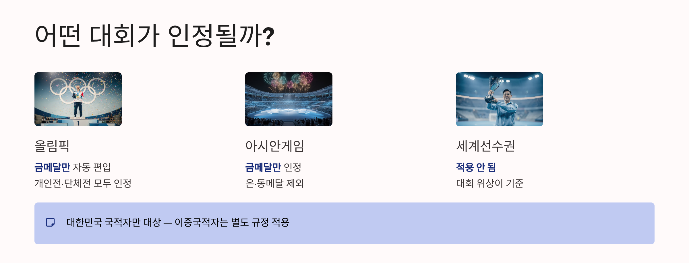 올림픽 금메달은 자동 편입 대상이에요. 은메달과 동메달은 해당되지 않아요. 아시안게임은 금메달만 인정돼요. 국제대회 종류가 중요해요.