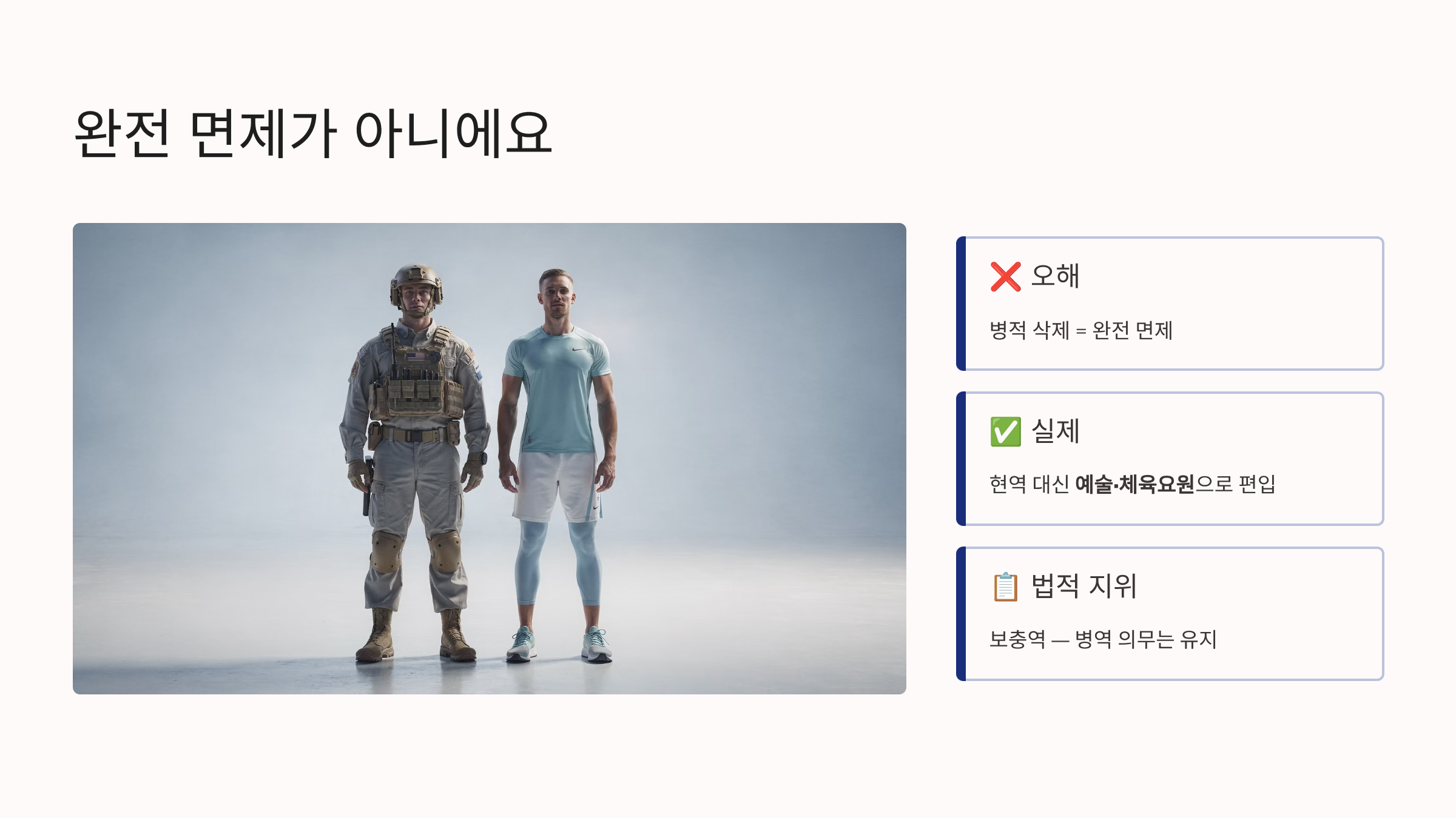 결론부터 말하면 완전 면제는 아니에요. 현역 복무 대신 예술·체육요원으로 편입되는 거예요. 병적에서 삭제되는 구조가 아니에요. 병역 의무는 유지돼요.
