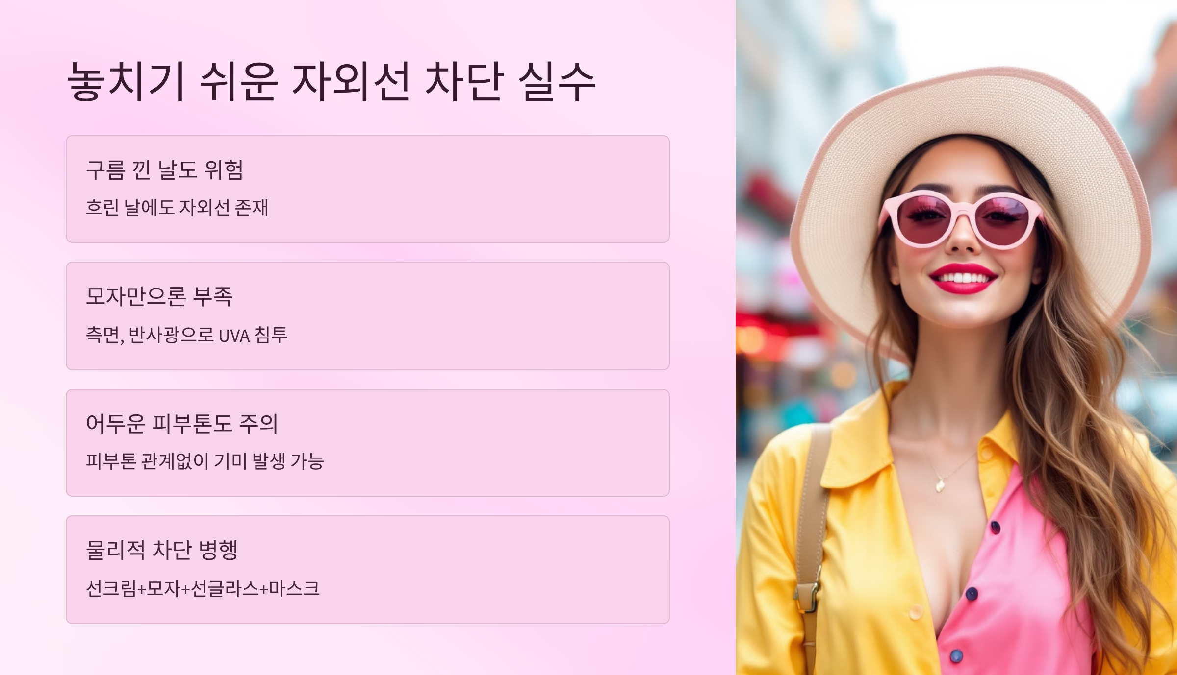 ✔ 피부톤 어두운 분들도 기미 생길 수 있어요. ✔ 선크림만으로 부족 → 물리적 차단(모자, 선글라스, 마스크) 병행 필수!
