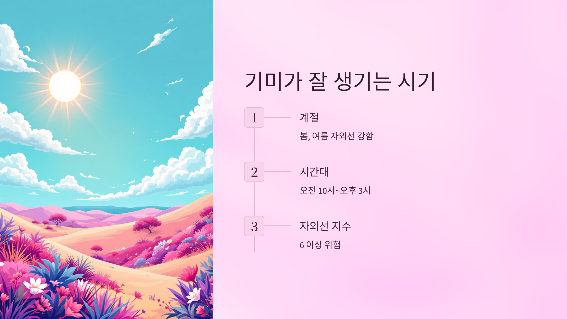 - 1. 자외선 지수 5 이상 → 외출 최소화 or 양산 필수