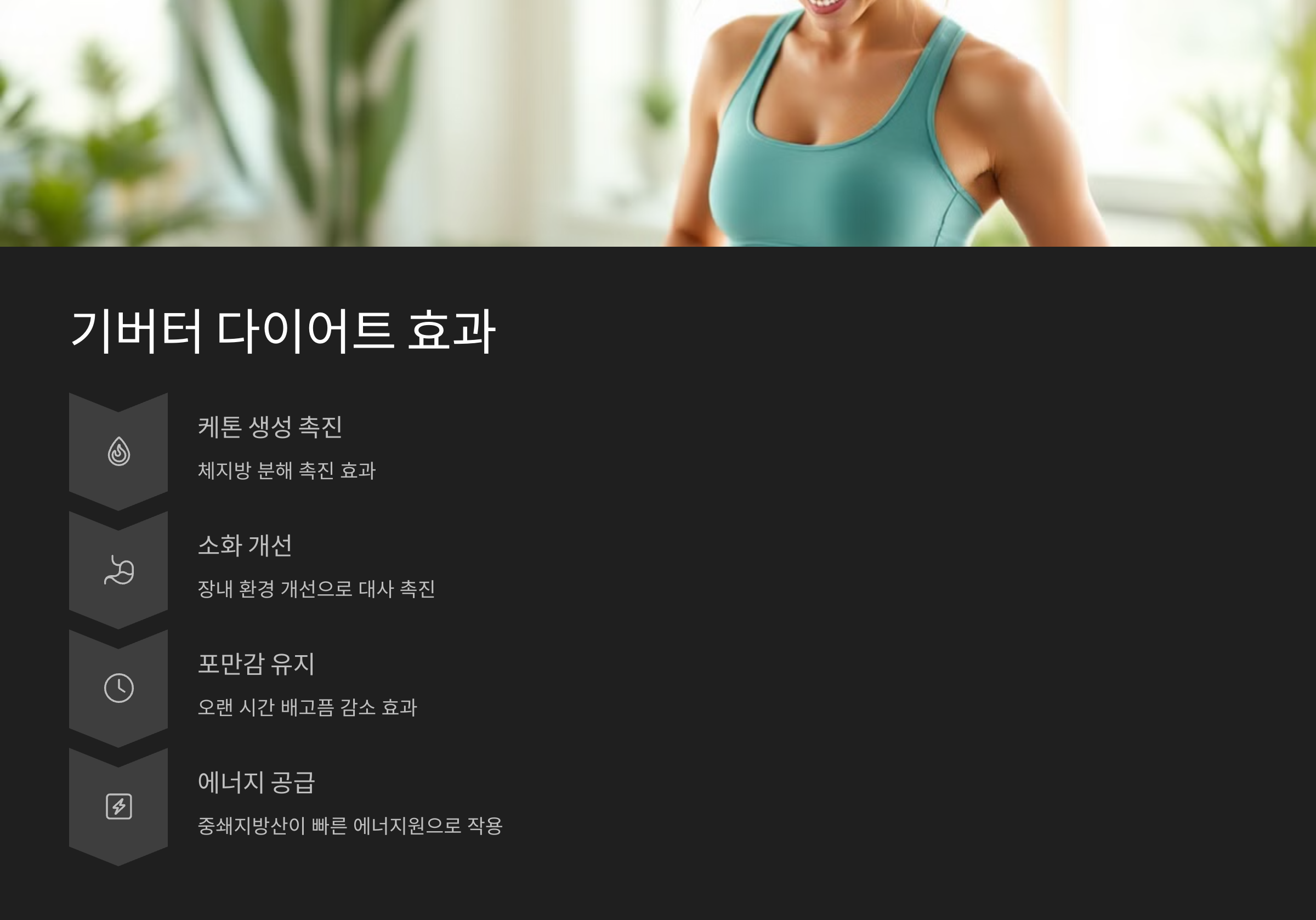 기버터 자체가 지방 연소를 촉진하는 것은 맞지만, 운동 없이 체중 감량을 기대하는 것은 어렵습니다. 기버터를 섭취하면서도 유산소 운동과 근력 운동을 병행해야 다이어트 효과를 극대화할 수 있어요. 🏋️♂️