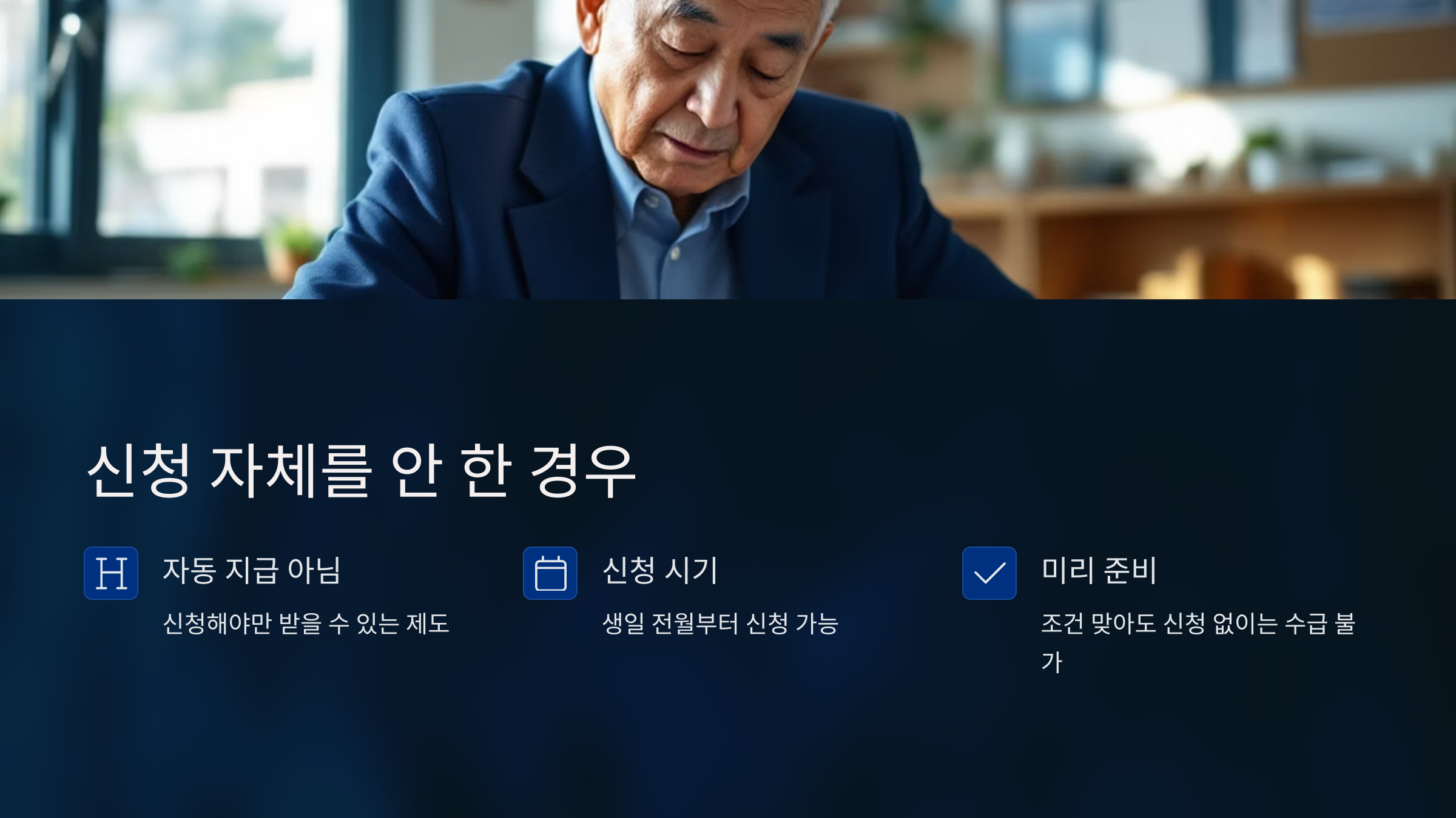 신청해야만 받을 수 있는 제도이기 때문에, 아무리 조건이 맞아도 신청하지 않으면 수급 대상이 될 수 없어요.