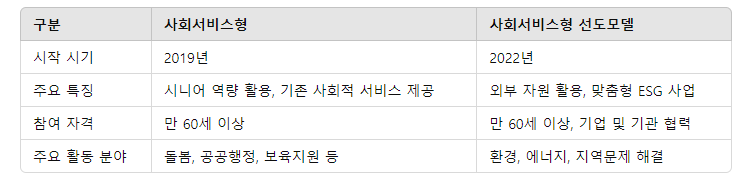 A: 사회서비스형은 시니어 역량을 활용한 기존 서비스 제공, 선도모델은 외부 자원 활용과 ESG 연계가 주요 차이입니다.