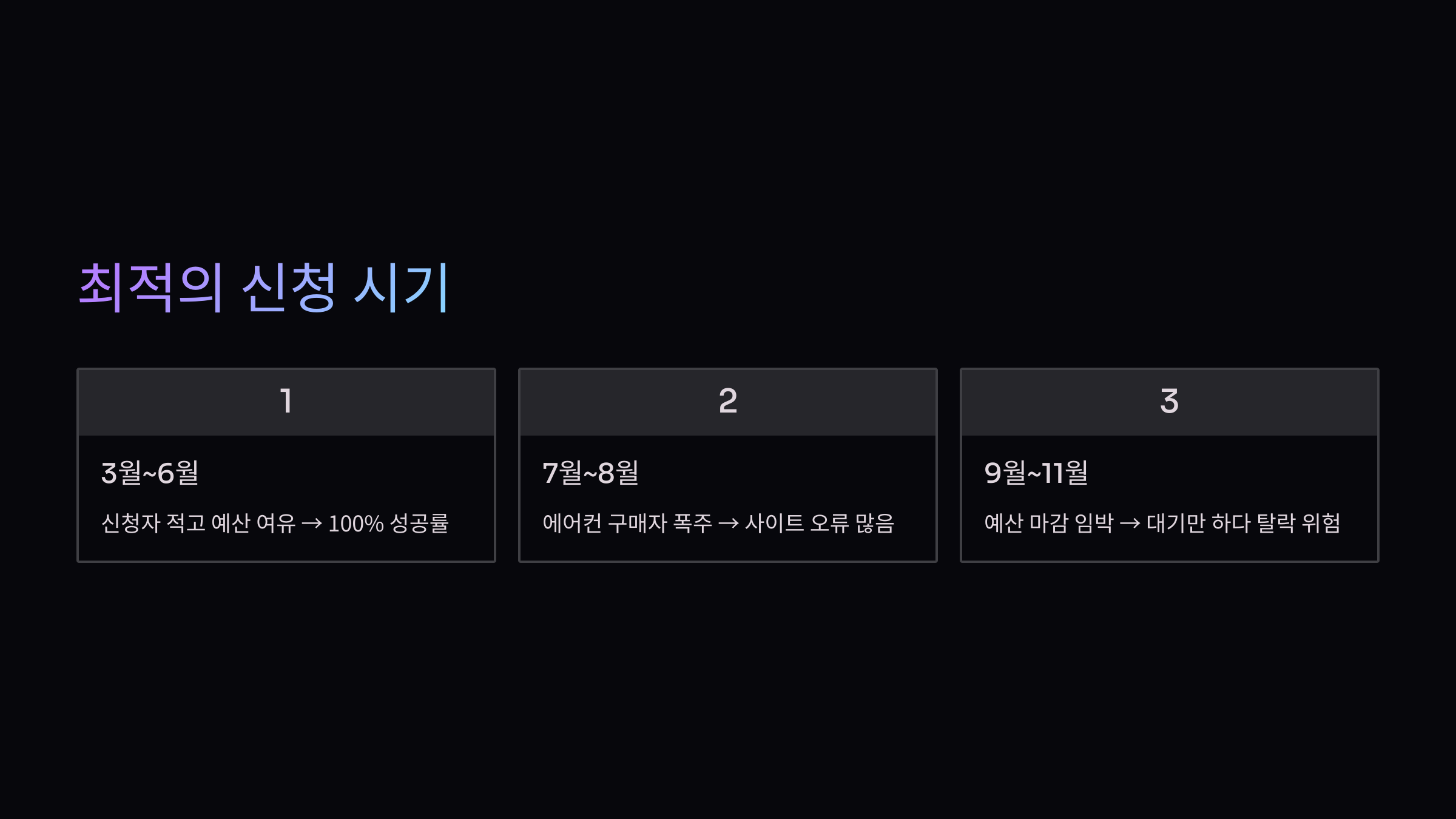 ⛔ 9월 ~ 11월: 예산 마감 임박 구간 → 이 시기에 신청하면 ‘대기’만 하다 끝나는 경우도 꽤 많아요.