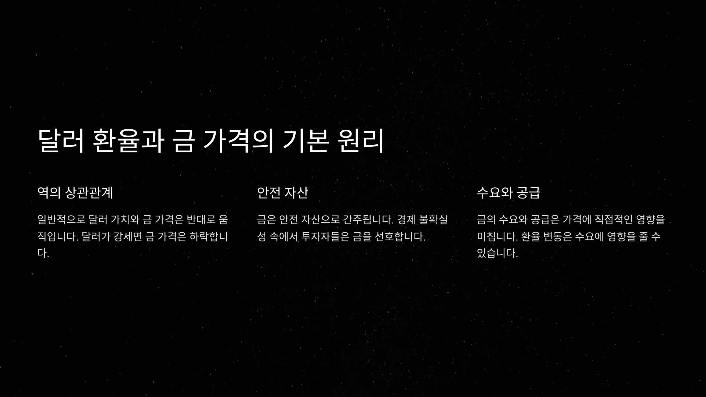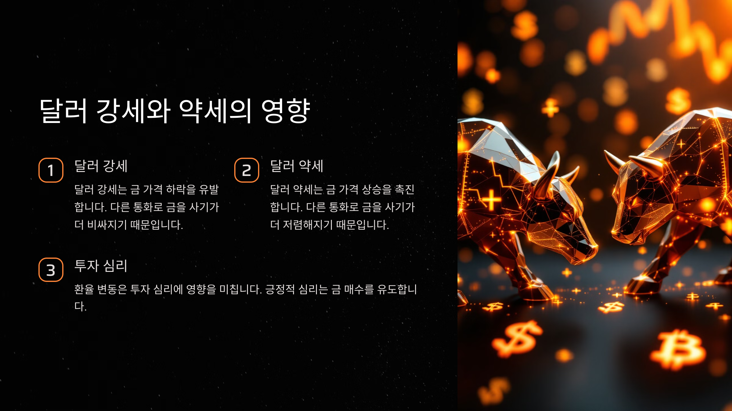 이 원리를 바탕으로, 경제 상황과 시장 심리에 따라 금 가격과 달러 가치가 어떻게 움직이는지 분석하는 것이 중요해요. 🔍