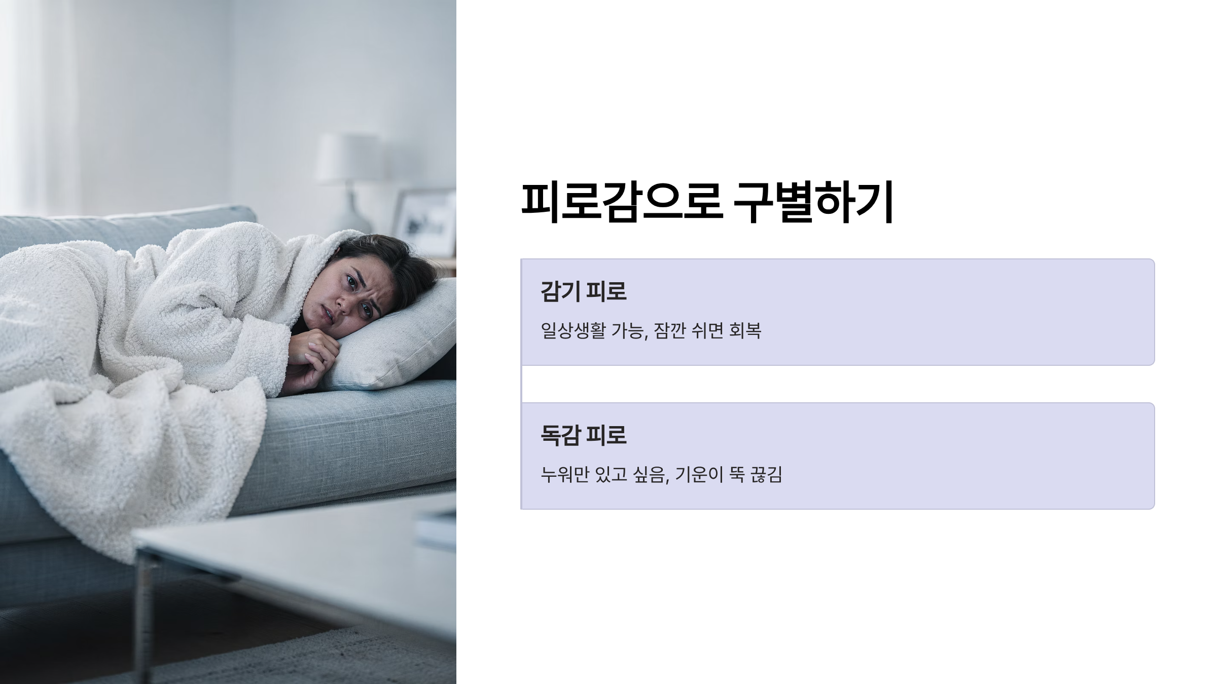 피로감도 중요한 구분 포인트예요. 감기는 피곤해도 일상생활이 가능한 경우가 많고 잠깐 쉬면 회복돼요.