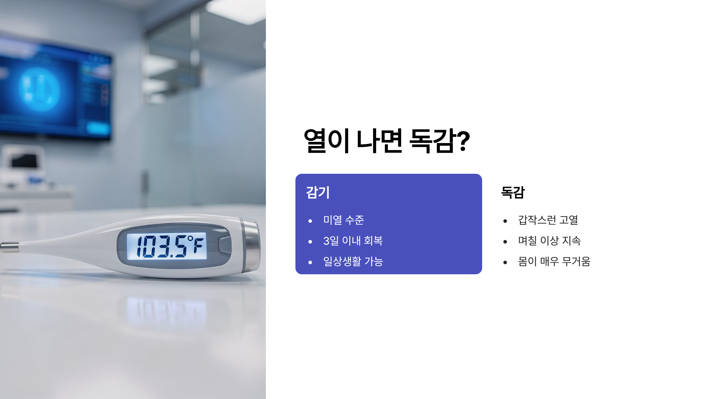 감기와 독감은 처음엔 비슷해 보일 수 있지만 열의 강도, 시작 속도, 피로감에서 차이가 나요.