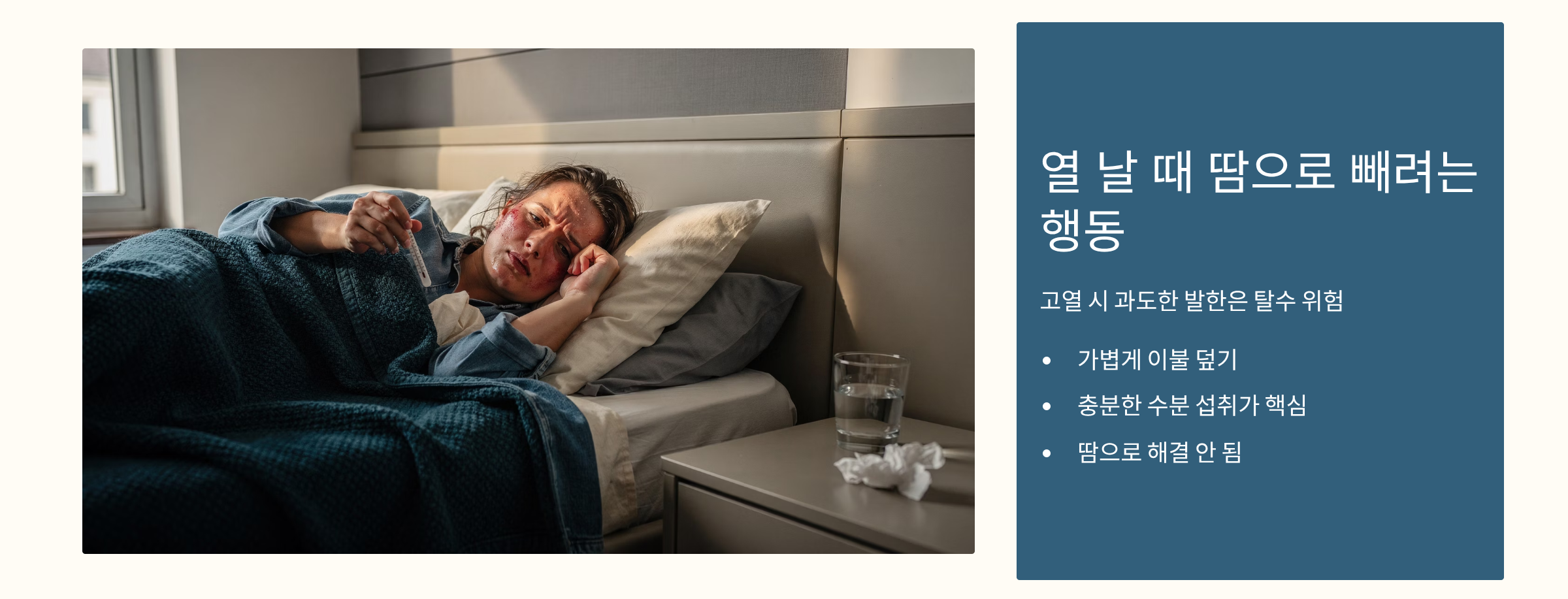 “땀 쭉 빼면 나아지지 않을까?” 많이들 이렇게 생각해요. 하지만 고열일 때 땀을 과도하게 내면 오히려 탈수되고 더 위험해질 수 있어요.