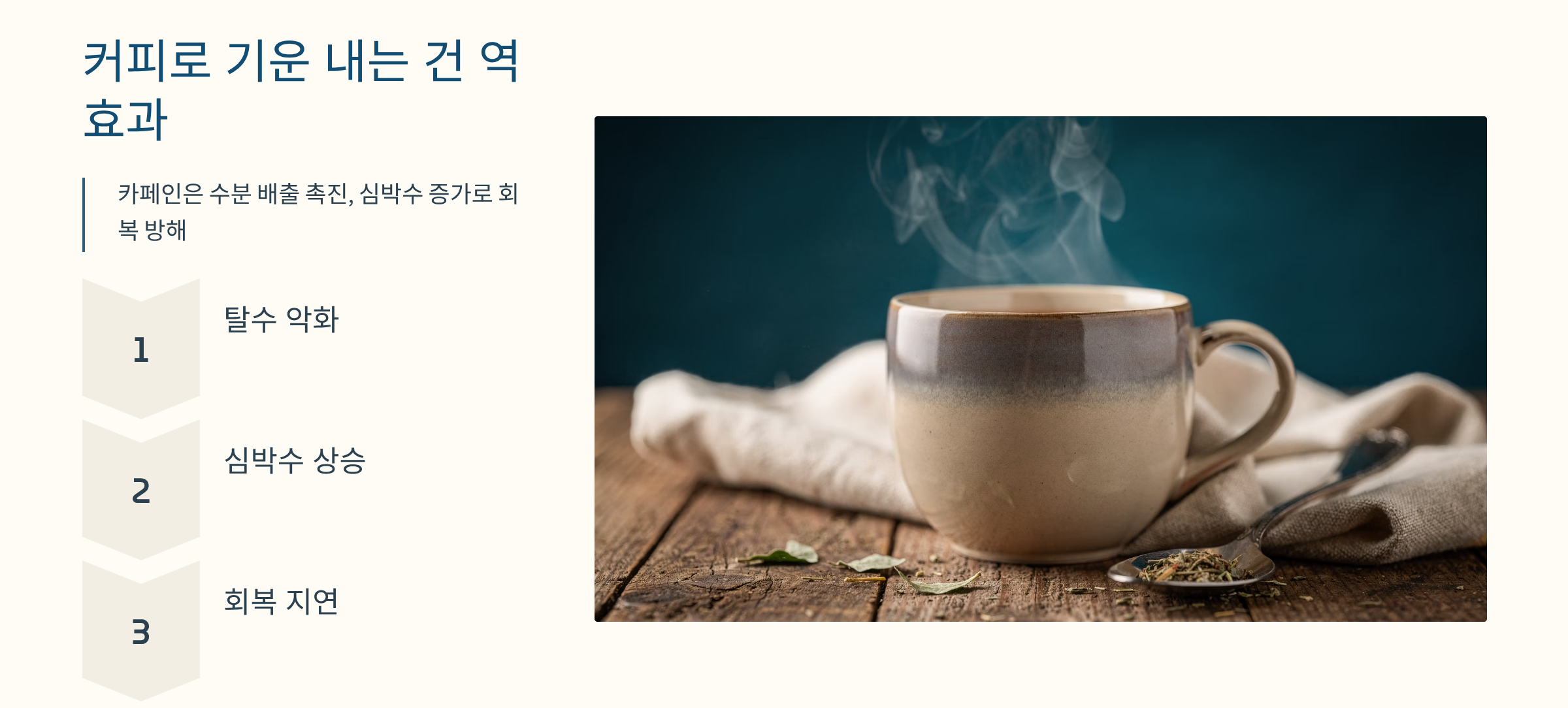 기운 없고 졸릴 때 커피 한 잔 마시고 버텨보겠다는 분들 많죠. 하지만 카페인은 수분을 더 빠지게 만들고 심박수도 높아져서 회복을 방해해요.