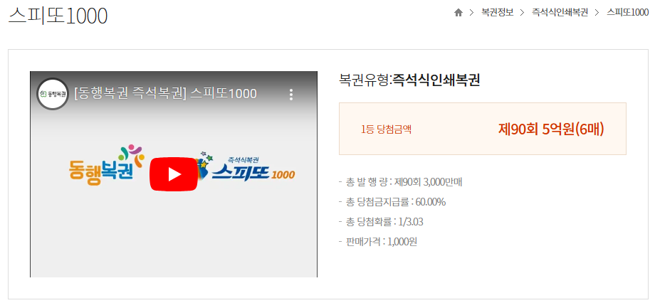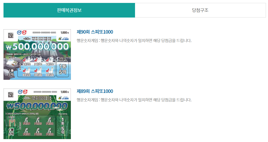 스피또1000: 1000원짜리 복권으로, 최고 당첨금은 5억 원이며, 당첨 확률이 비교적 높습니다.