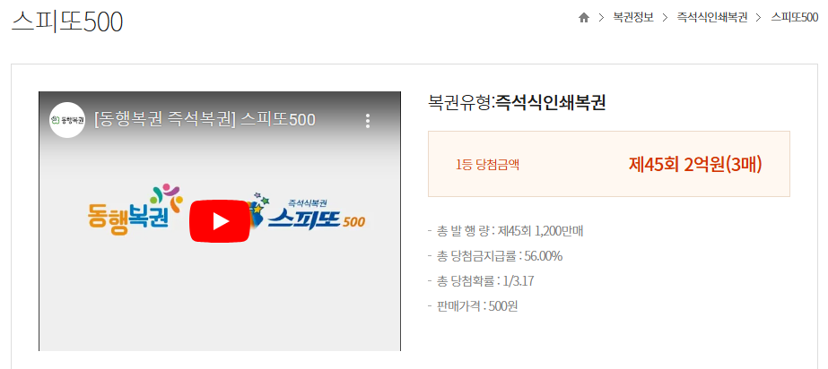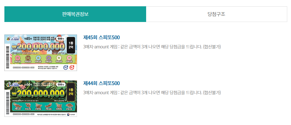 스피또500: 구매 가격은 500원으로, 최고 당첨금은 2억 원입니다. 상대적으로 낮은 가격이 장점입니다.