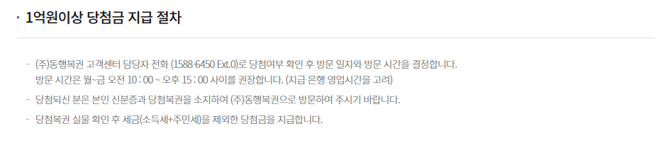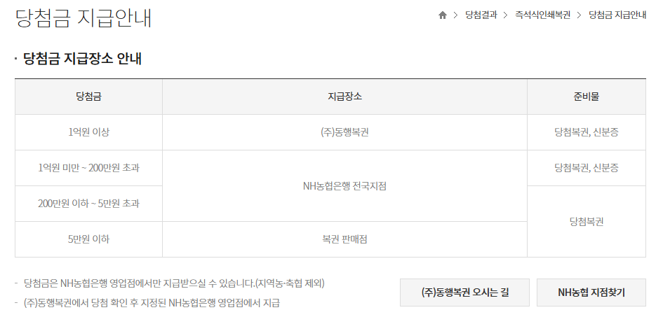 소액 당첨금은 판매점에서, 고액 당첨금은 금액에 따라 동행복권이나 NH농협은행에서 수령 가능합니다.