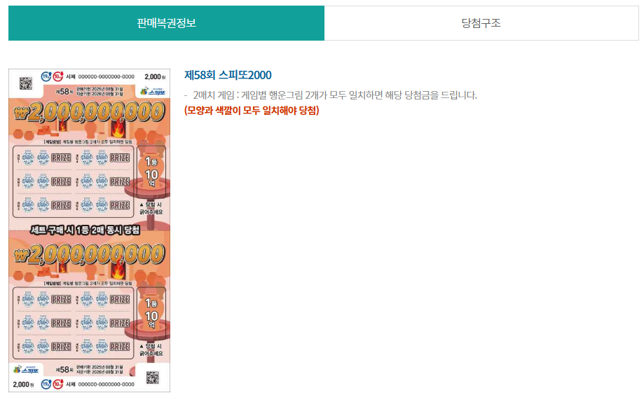 스피또2000: 2000원에 판매되며, 최고 당첨금은 무려 10억 원입니다. 높은 상금을 노리는 사람들이 주로 구매합니다.