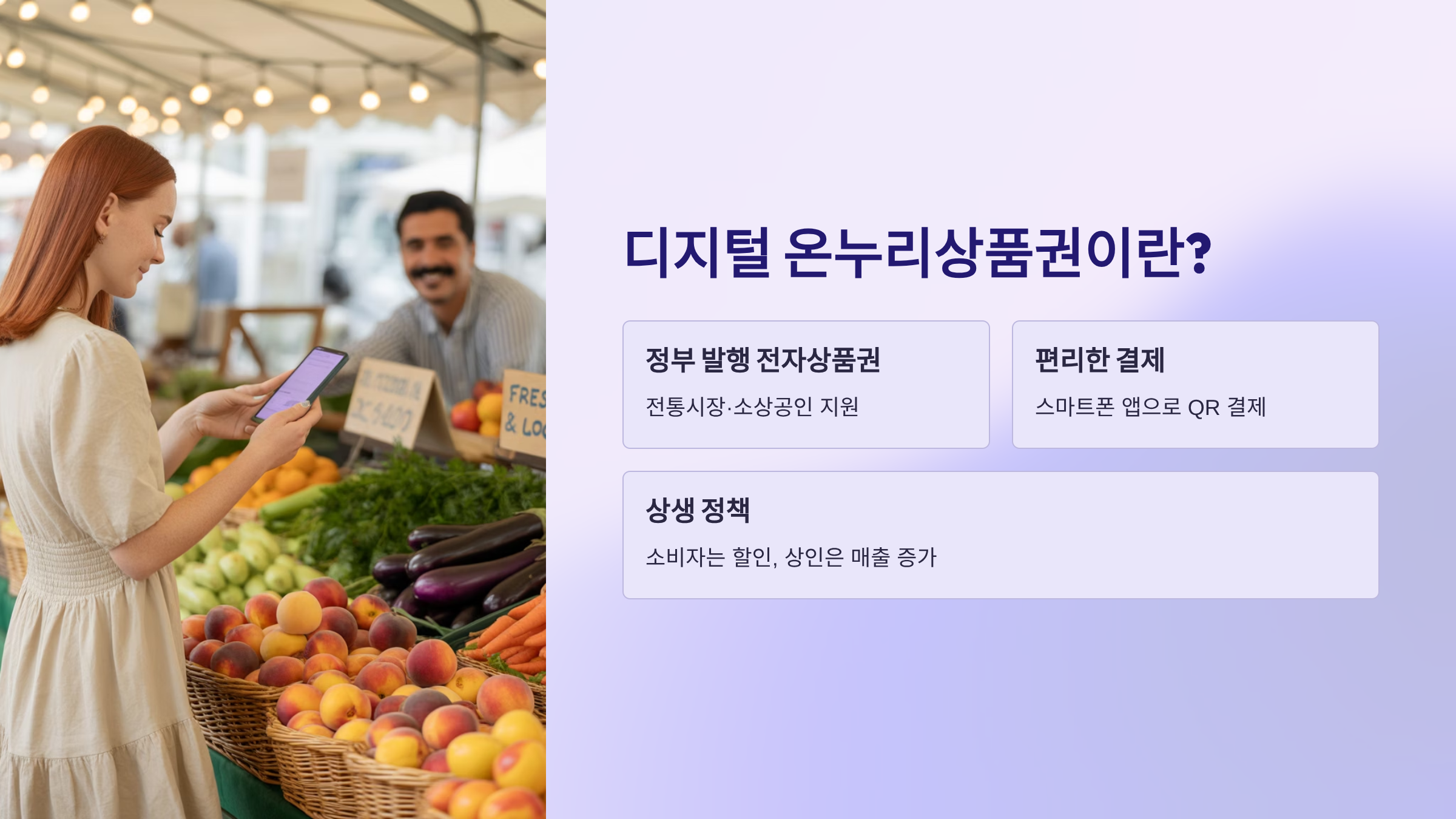 디지털 온누리상품권은 정부가 발행한 전자형 상품권이에요. 전통시장과 소상공인을 지원하고, 소비자에게 할인 혜택을 주기 위해 만들어졌어요. 🤝