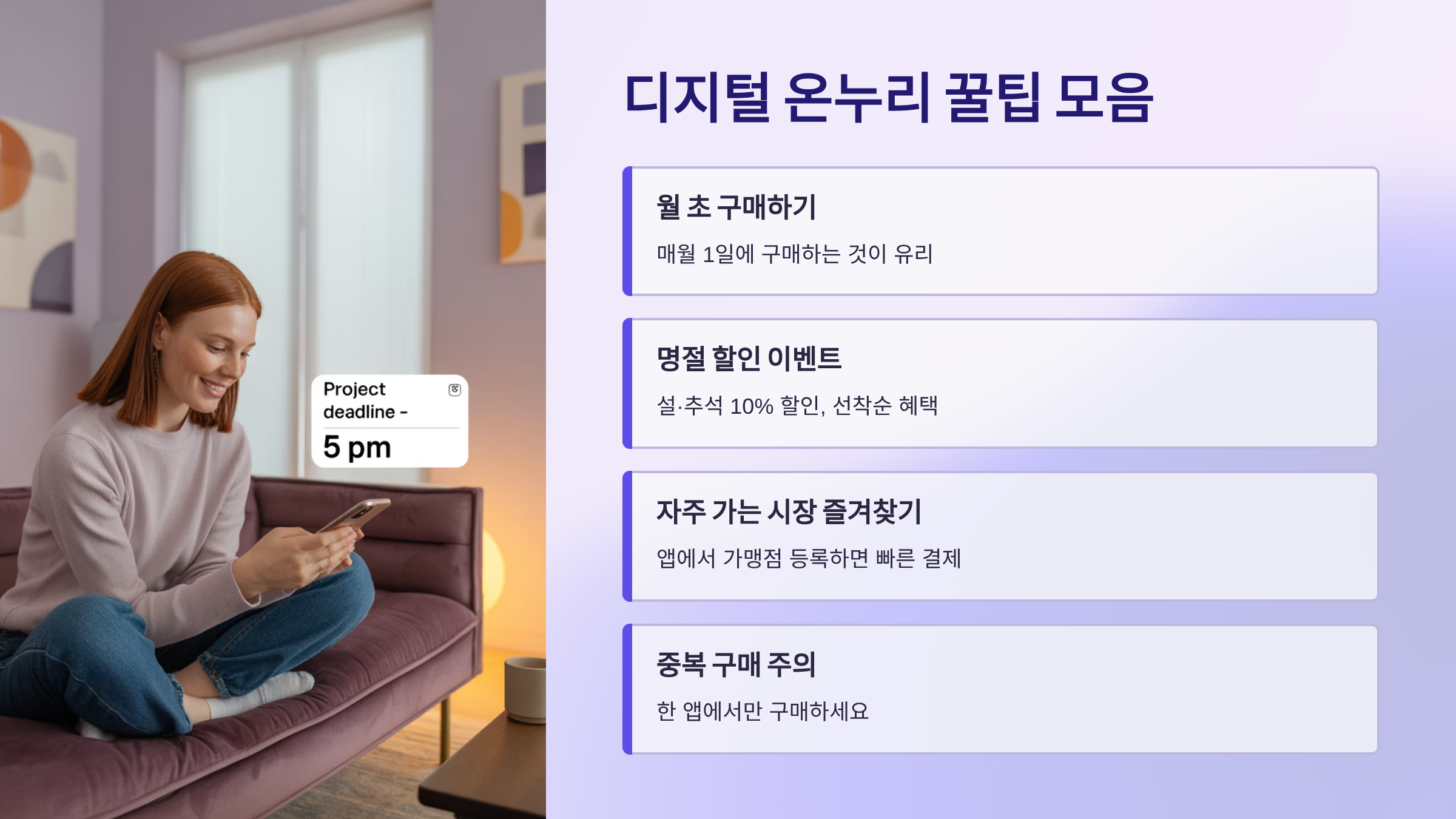디지털 온누리상품권은 평상시 5% 할인으로 구매할 수 있고, 설·추석 등 명절에는 최대 10% 할인도 제공돼요. 🎁