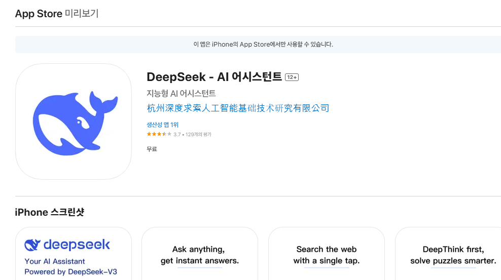 아이폰 사용자는 App Store에서 '딥시크'를 검색해 설치하면 됩니다. 다운로드가 완료되면 앱을 실행하세요.