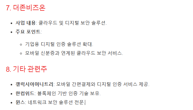 8. 기타 주목 기업: 갤럭시아머니트리, 윈스, 한컴위드 등이 관련주로 주목받고 있습니다.