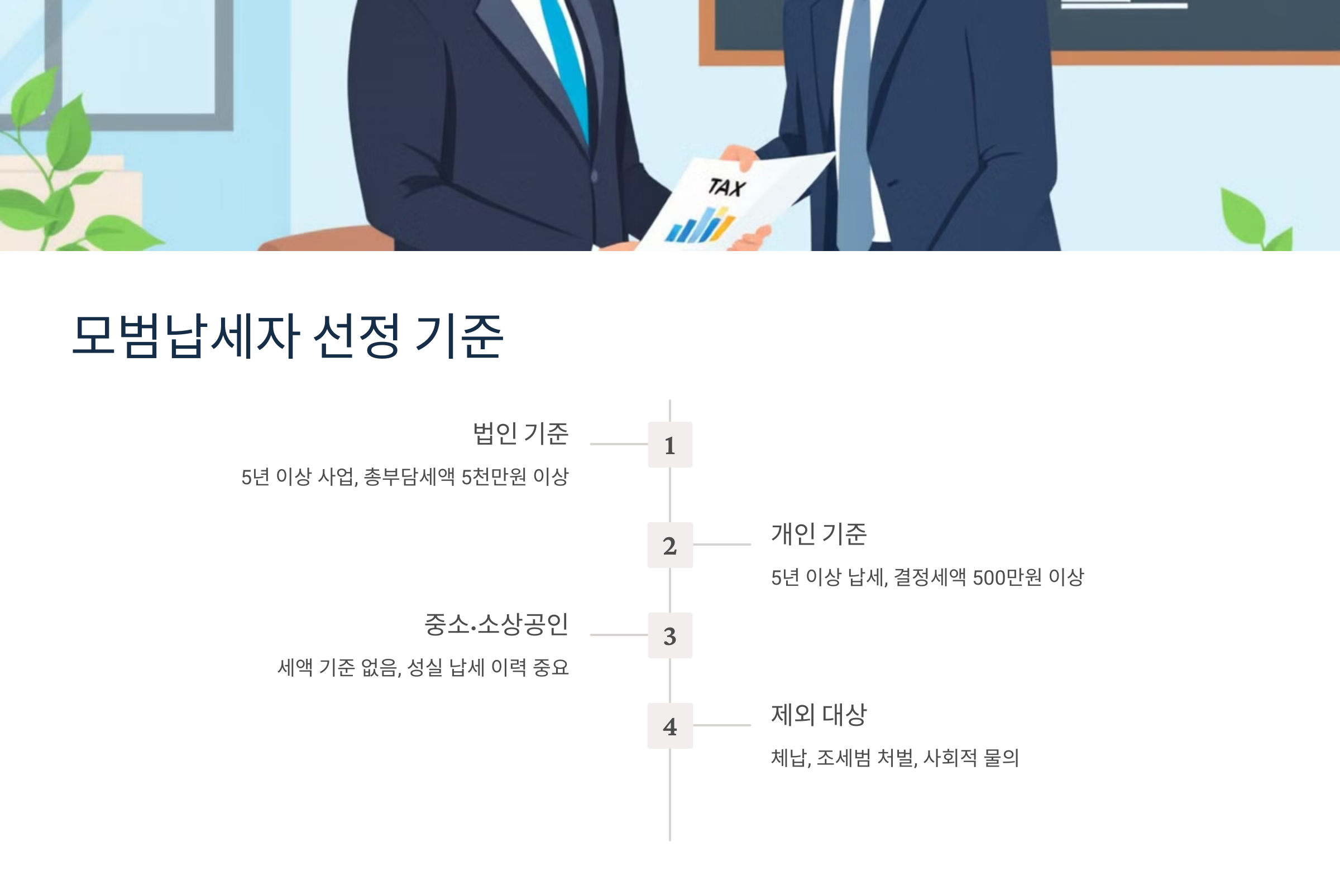 모범납세자로 선정되려면 일정한 기준이 있어요. 🔍