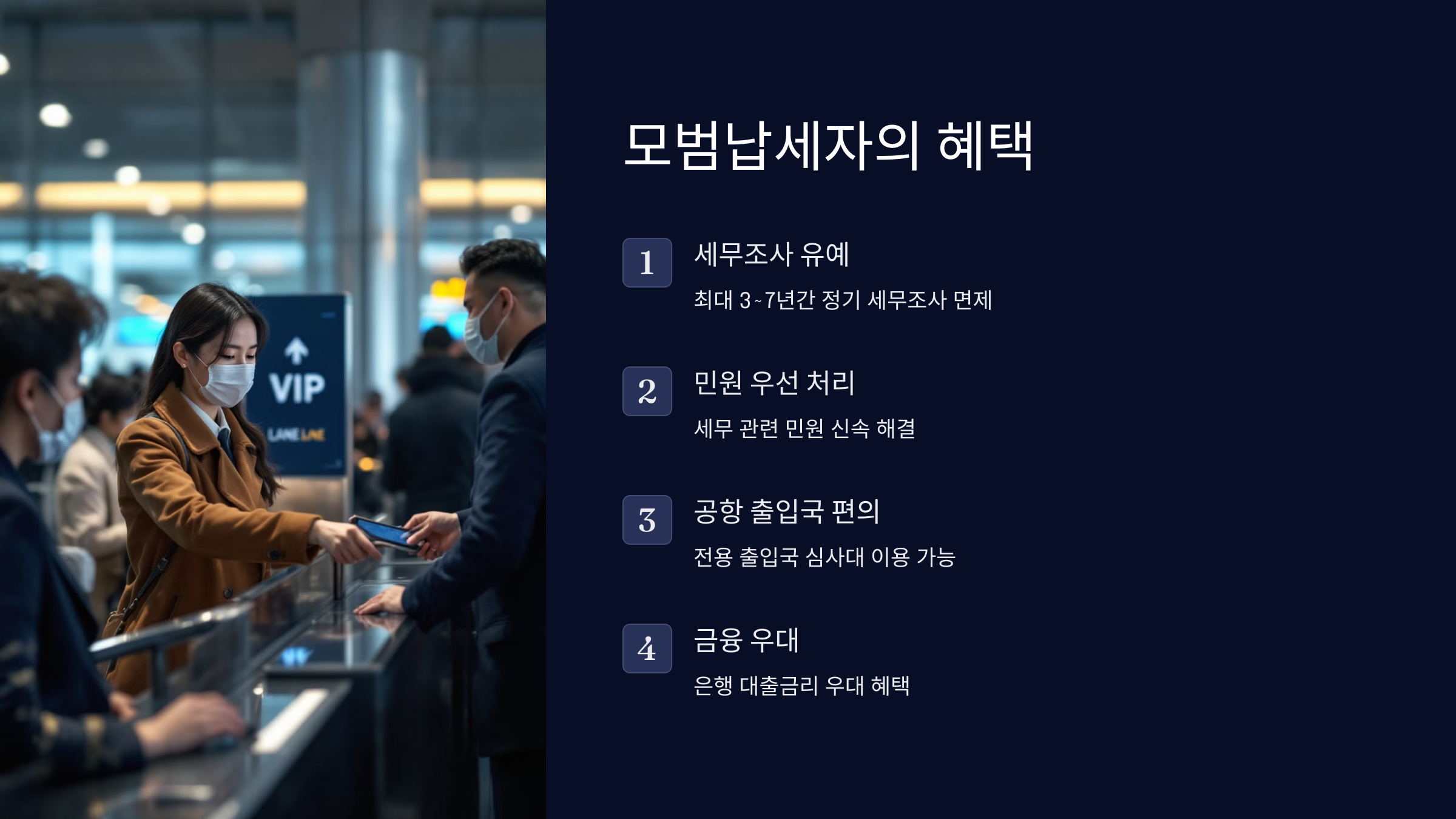 모범납세자로 인정받으면 단순한 명예뿐만 아니라 실제로 쏠쏠한 혜택도 따라와요! 👏 특히 기업뿐만 아니라 개인도 받을 수 있는 혜택이 많아서 요즘 관심이 점점 높아지고 있죠.