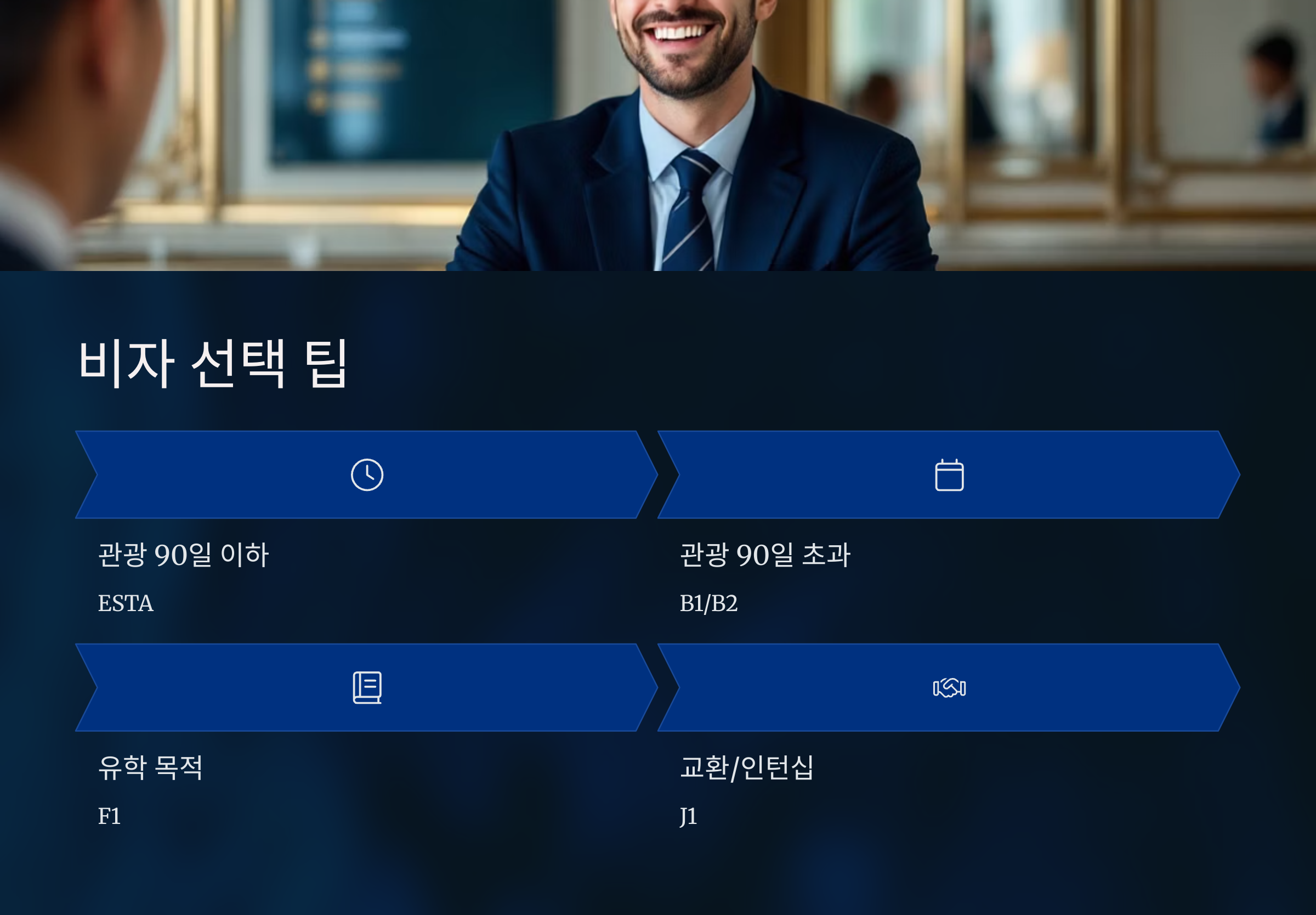 무비자 프로그램인 ESTA부터, 관광용 B1/B2, 유학용 F1, 교환방문 J1까지… 다양한 비자 중 어떤 게 내 목적에 맞는지 확실히 구분해야 해요.