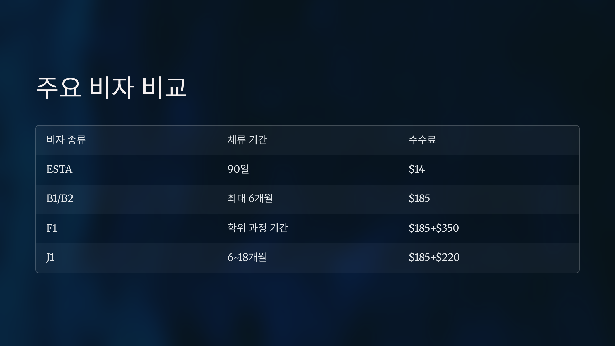 이 표를 보면 ESTA는 단기 여행용, F1은 학위 과정 유학용임을 알 수 있어요. 각 비자의 목적과 체류 기간, 수수료 차이를 꼭 확인하세요!