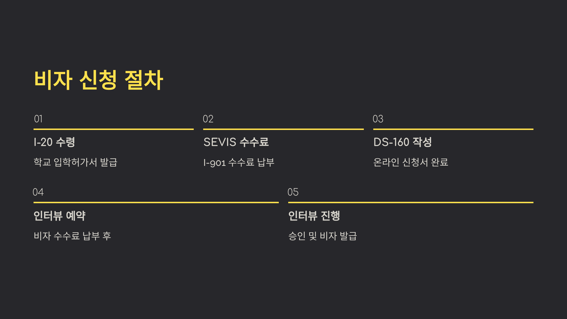 F-1 비자는 단순한 방문비자와 달리, 미국 정부가 정식으로 인정한 학교(대학, 어학원, 직업학교 등)에 등록해야 신청할 수 있어요. 입학 허가서(I-20)를 발급받아야 하며, 학업 목적이 뚜렷해야 합니다.