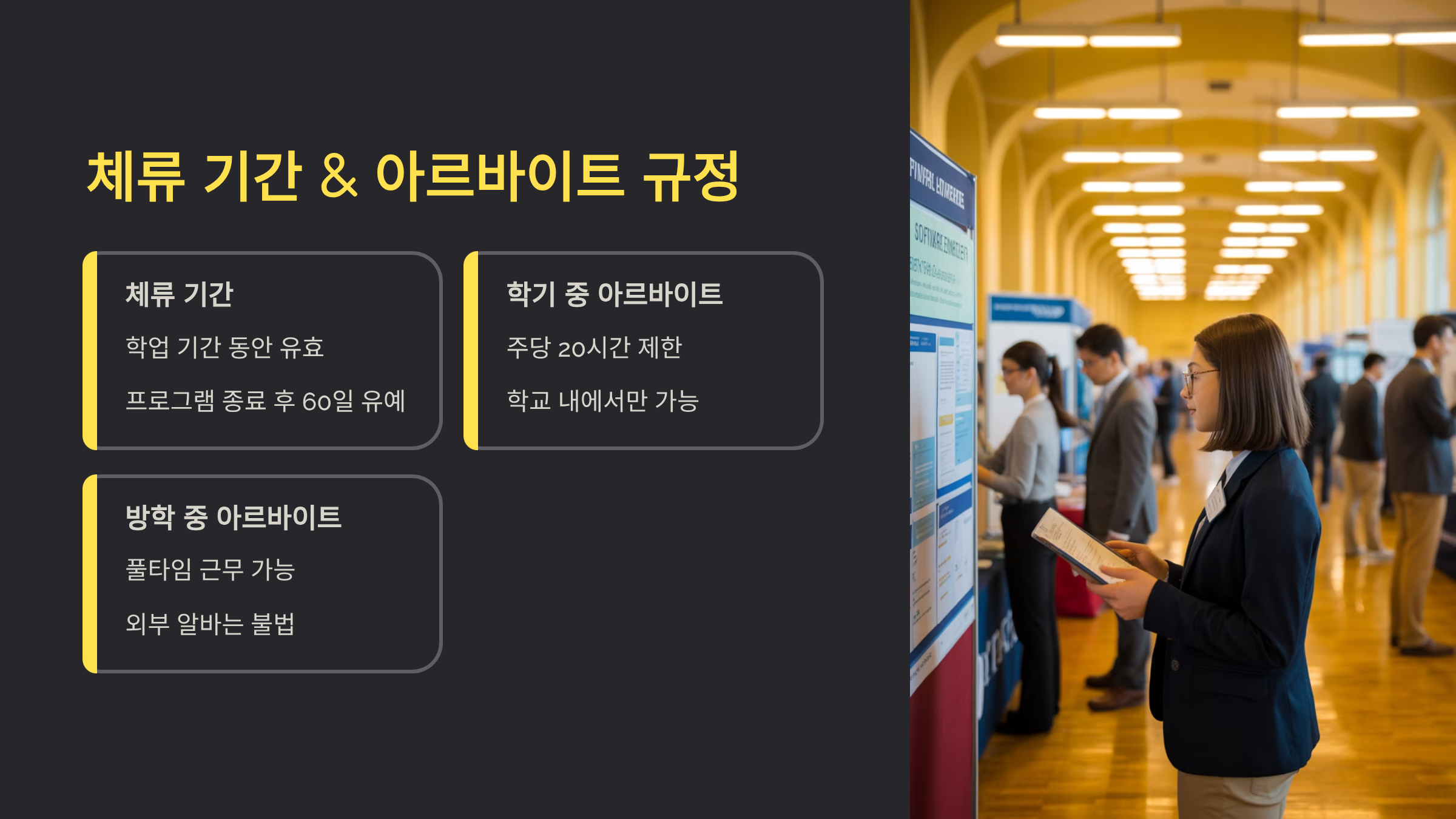 아르바이트는 제한적이에요. 학기 중에는 주당 20시간, 방학 중에는 풀타임이 가능하지만 반드시 학교 내에서만 일할 수 있습니다. 학업과 무관한 외부 알바는 불법이니 주의해야 합니다.