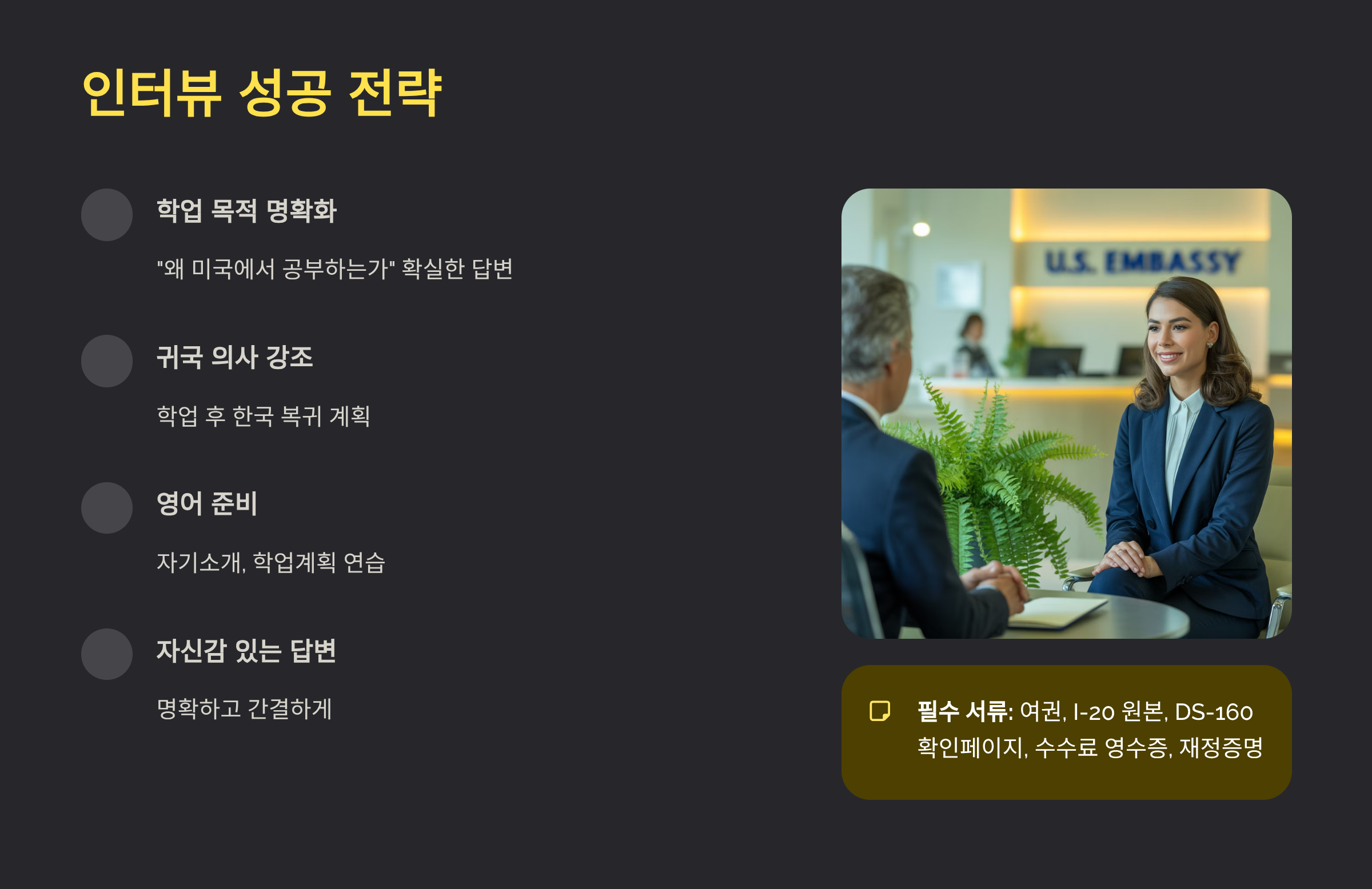 인터뷰에서는 “왜 미국에서 공부하려는지, 학업 계획은 뭔지”를 확실히 설명할 수 있어야 해요. 본인의 학업 목적이 명확하고, 학업 후 한국으로 돌아올 의사가 있다는 점을 강조하는 것이 중요합니다.