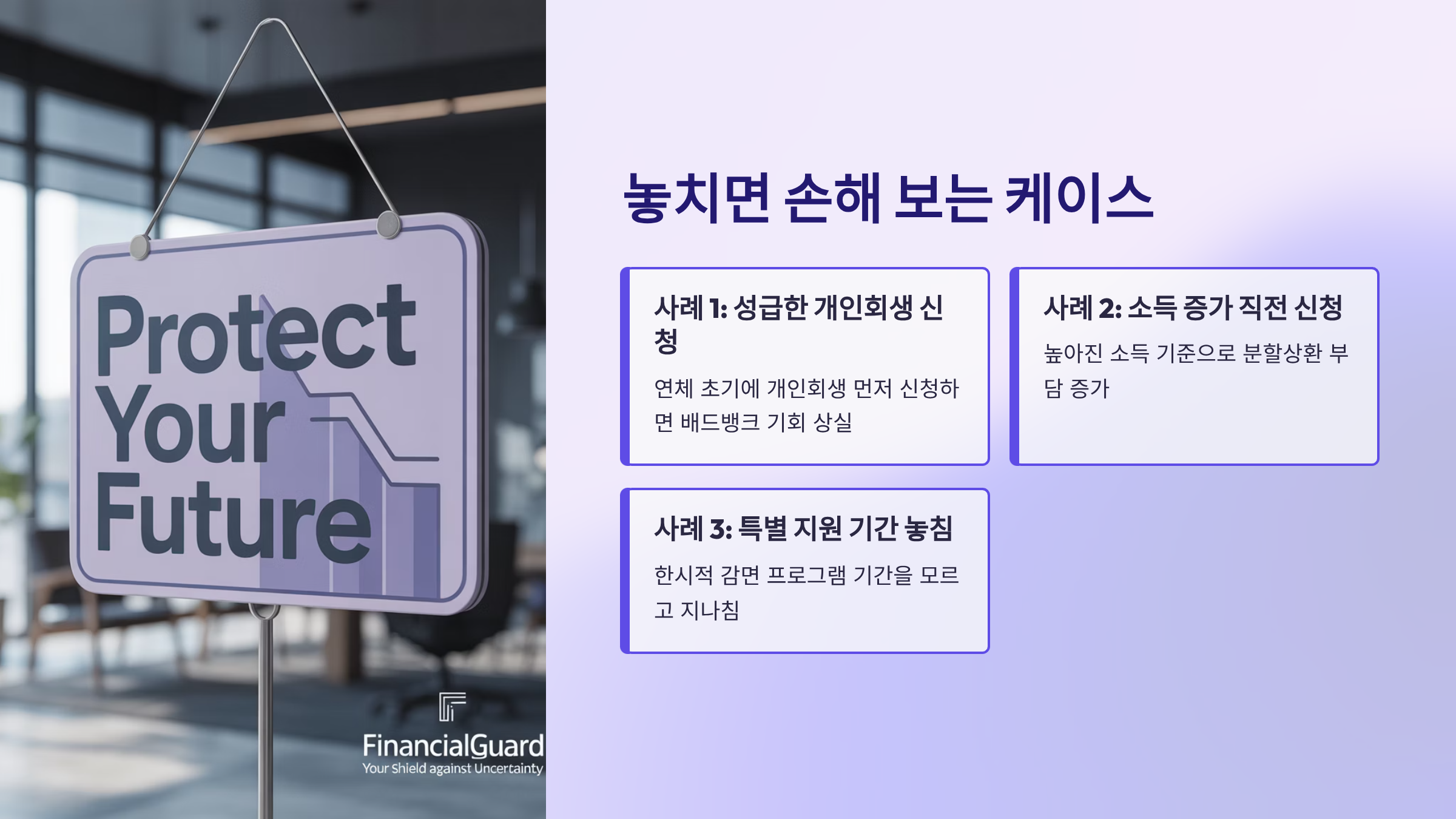 또한 본인의 연체 상태, 소득 발생 시점, 자산 상황 등 개인 조건에 따라 신청 타이밍을 전략적으로 선택하는 게 정말 중요해요. 무작정 신청했다가 불이익을 받는 사례도 실제로 적지 않아요.