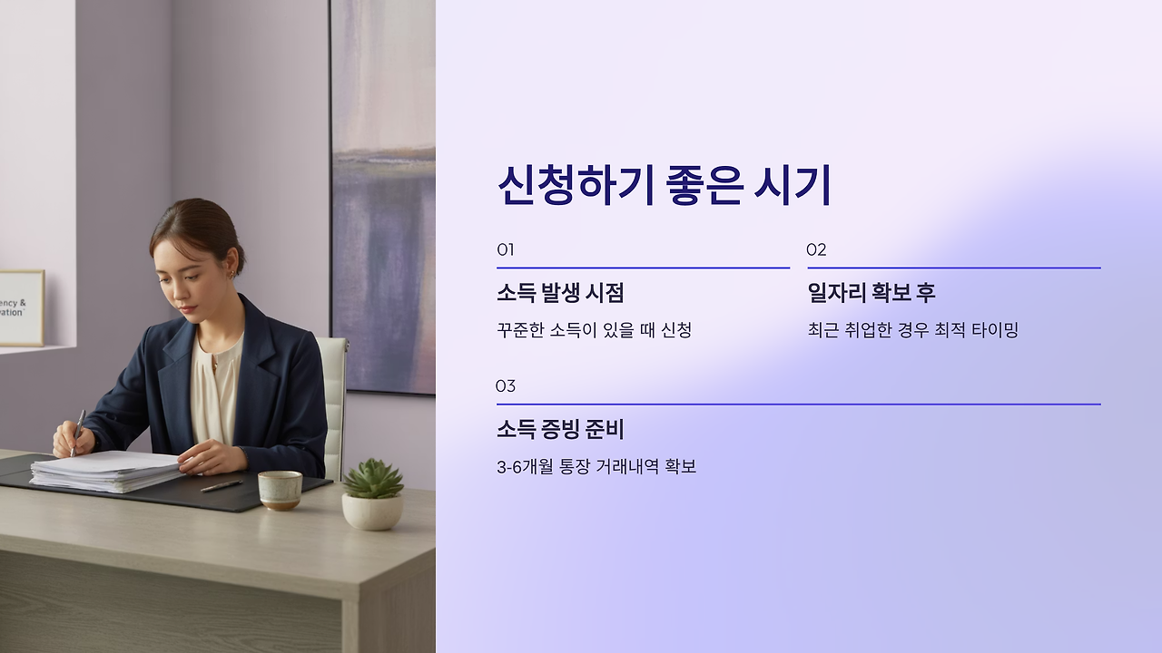 프리랜서나 자영업자처럼 소득이 불규칙한 경우에는 최근 3~6개월 통장 거래내역이나 계약서 등으로 증빙을 준비하면 좋아요. 신청은 ‘가능한 시기’보단 ‘유리한 시기’를 잡는 게 핵심이에요.