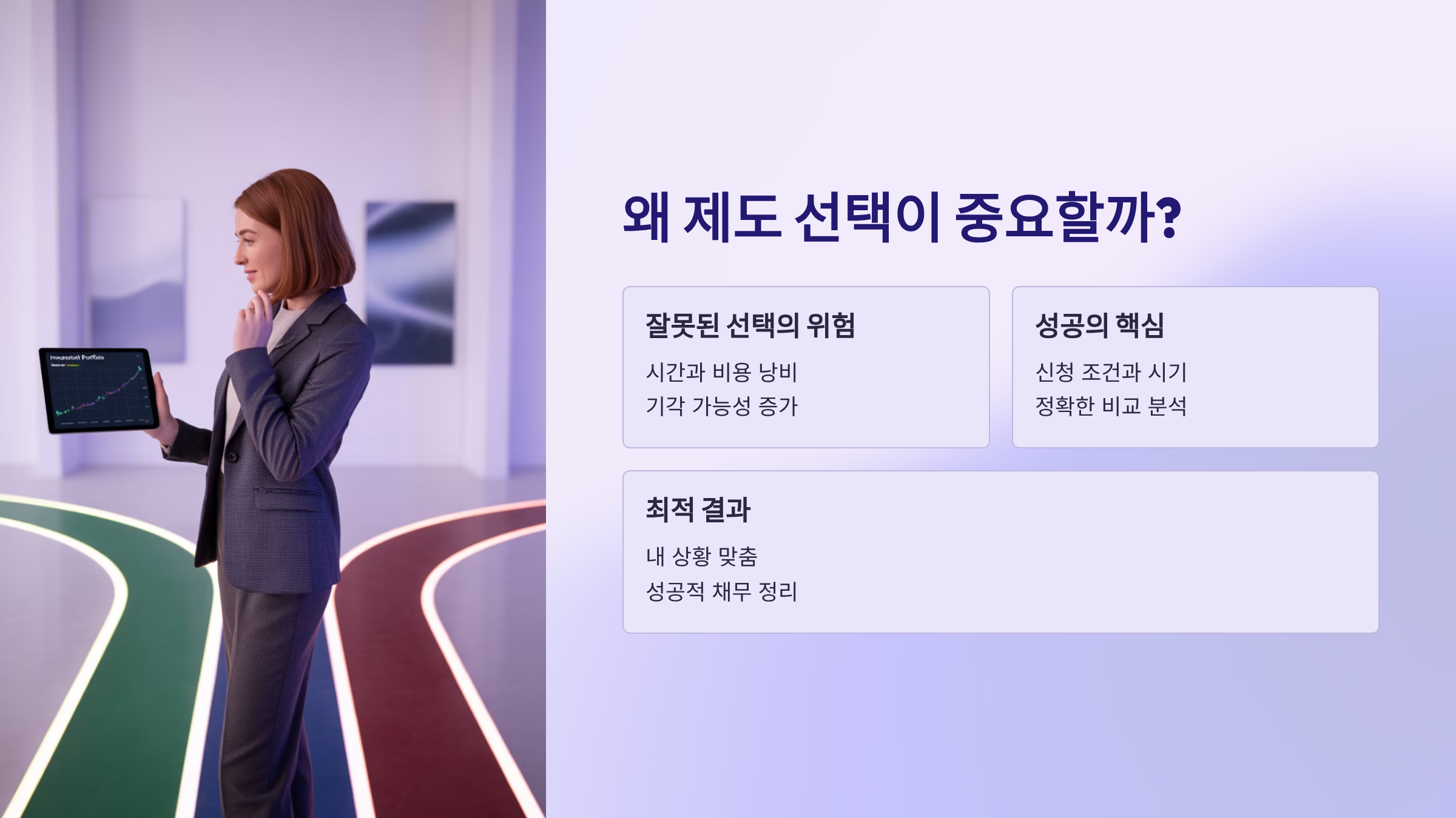 이 표를 보면 배드뱅크, 개인회생, 워크아웃의 차이가 한눈에 들어오죠? 자신의 조건과 상황을 기준으로 선택하면 돼요.