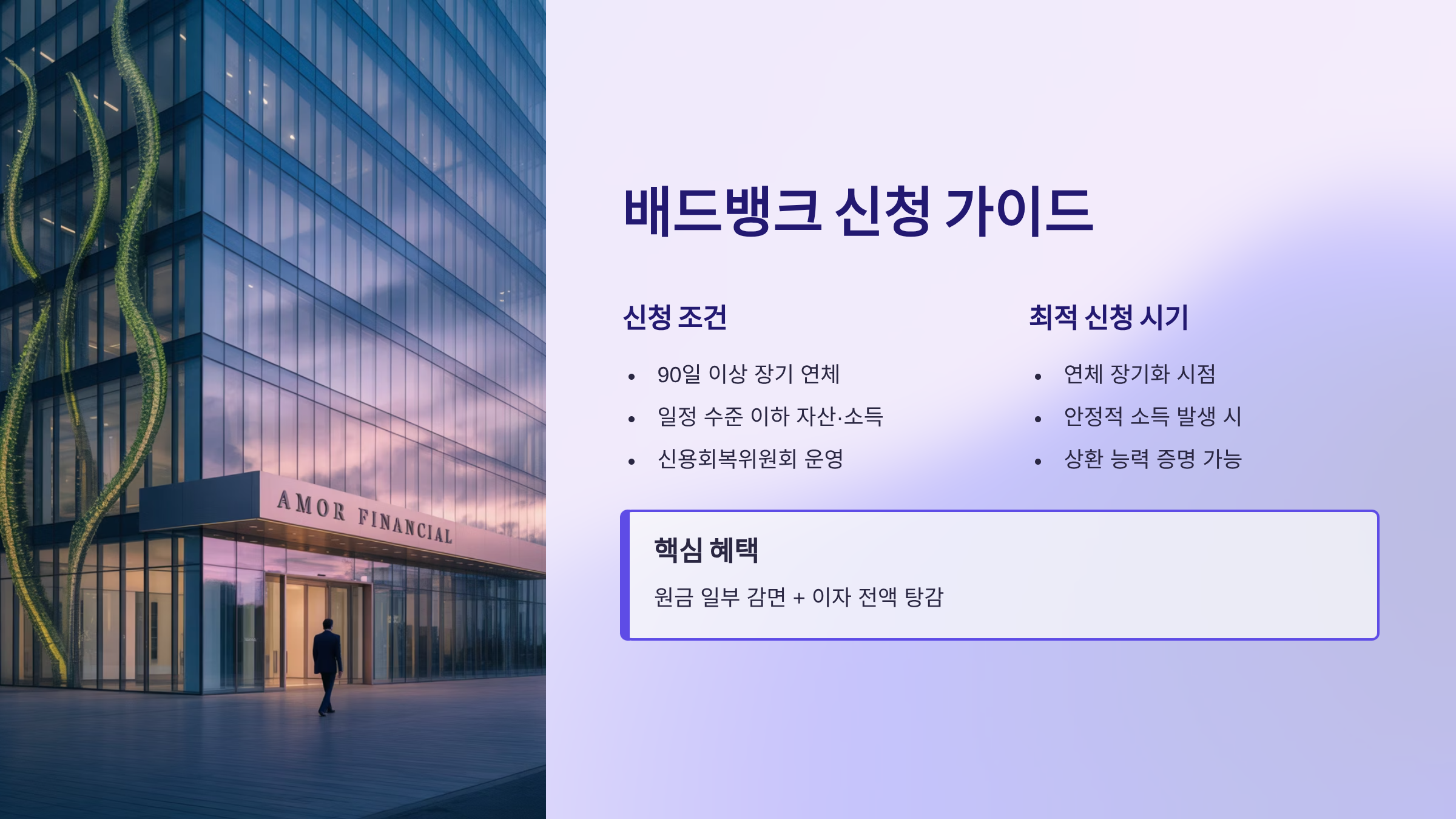 | 배드뱅크 | 장기 연체 90일↑, 자산·소득 기준 충족 | 소득 안정 시, 장기 연체 확인 시 | 원금 일부 감면 + 이자 전액 탕감 | 대상 범위 제한적 |