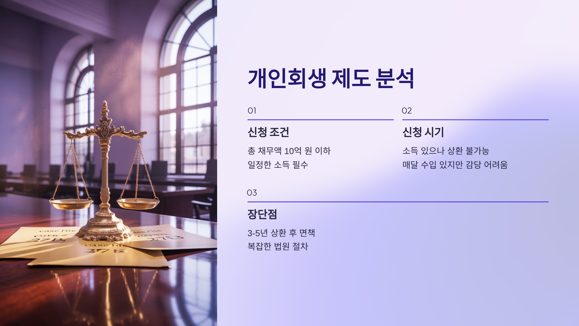 개인회생의 장점은 최대 3~5년 동안 일정 금액을 상환하면 나머지 채무를 면책받을 수 있다는 점이에요. 하지만 단점은 법원 절차가 복잡하고, 신용등급 하락이 심하다는 점이에요.