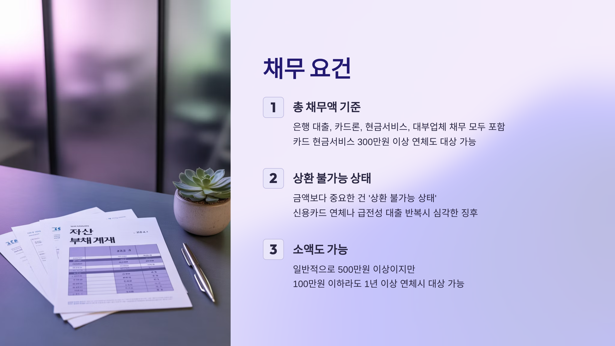 기본적으로는 총 채무액이 일정 수준 이상이어야 신청이 가능해요. 여기에는 은행 대출뿐만 아니라 카드론, 현금서비스, 대부업체 채무도 모두 포함돼요. 예를 들어, 카드 현금서비스만 300만 원 이상 연체되었더라도, 장기간 상환이 안 되고 있다면 대상이 될 수 있어요.
