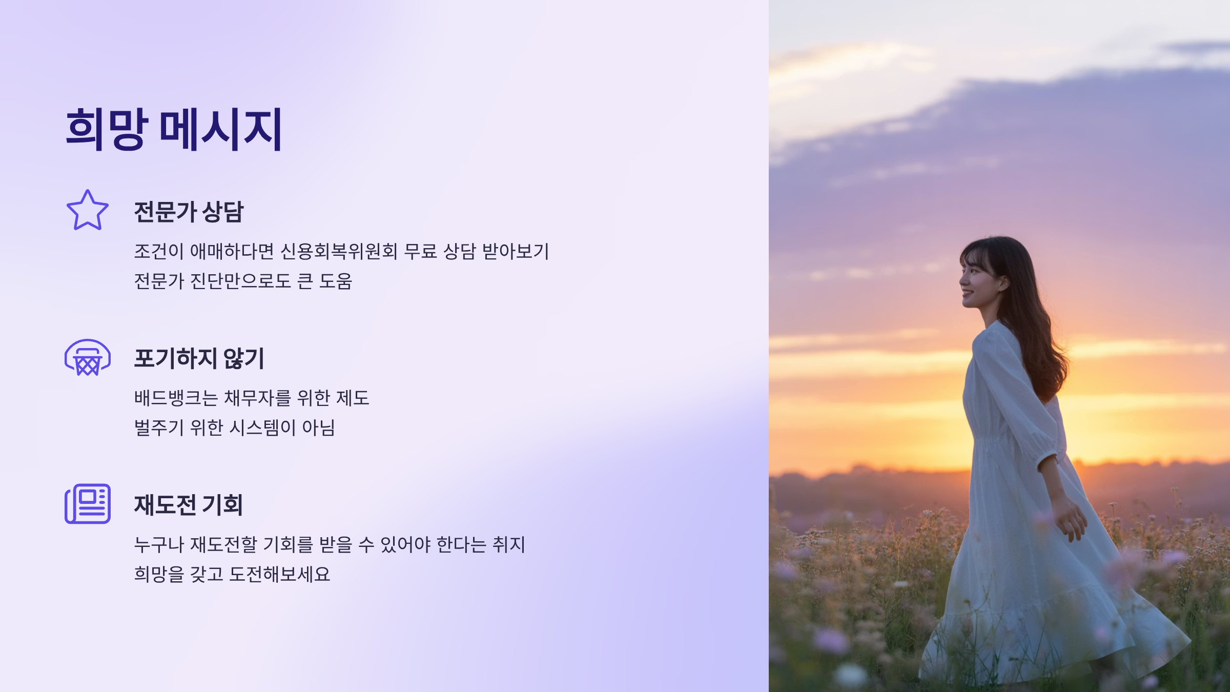 무엇보다 중요한 건 ‘포기하지 않는 것’이에요. 배드뱅크 제도는 채무자를 위한 제도지, 그들을 벌주기 위한 시스템이 아니에요. 누구나 재도전할 기회를 받을 수 있어야 한다는 취지에서 만들어졌기 때문에, 희망을 갖고 도전해보세요.