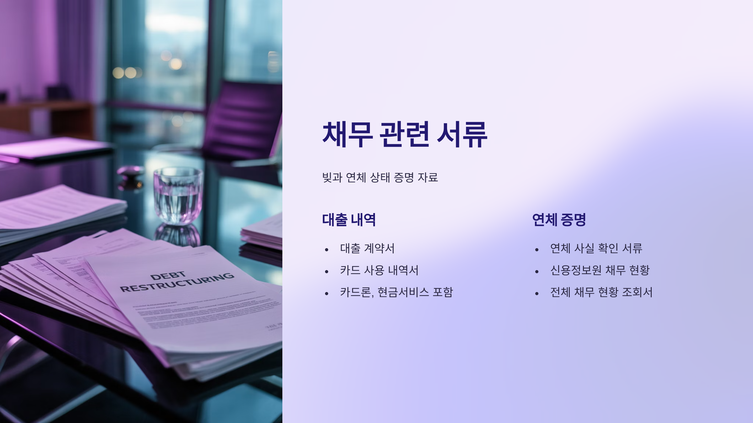 이 자료들은 단순히 "빚이 있다"는 말만으로는 부족하기 때문에 반드시 제출해야 하는 핵심 서류들이에요. 서류가 없으면 심사가 중단될 수 있으니 미리 발급받아 두는 게 안전해요.