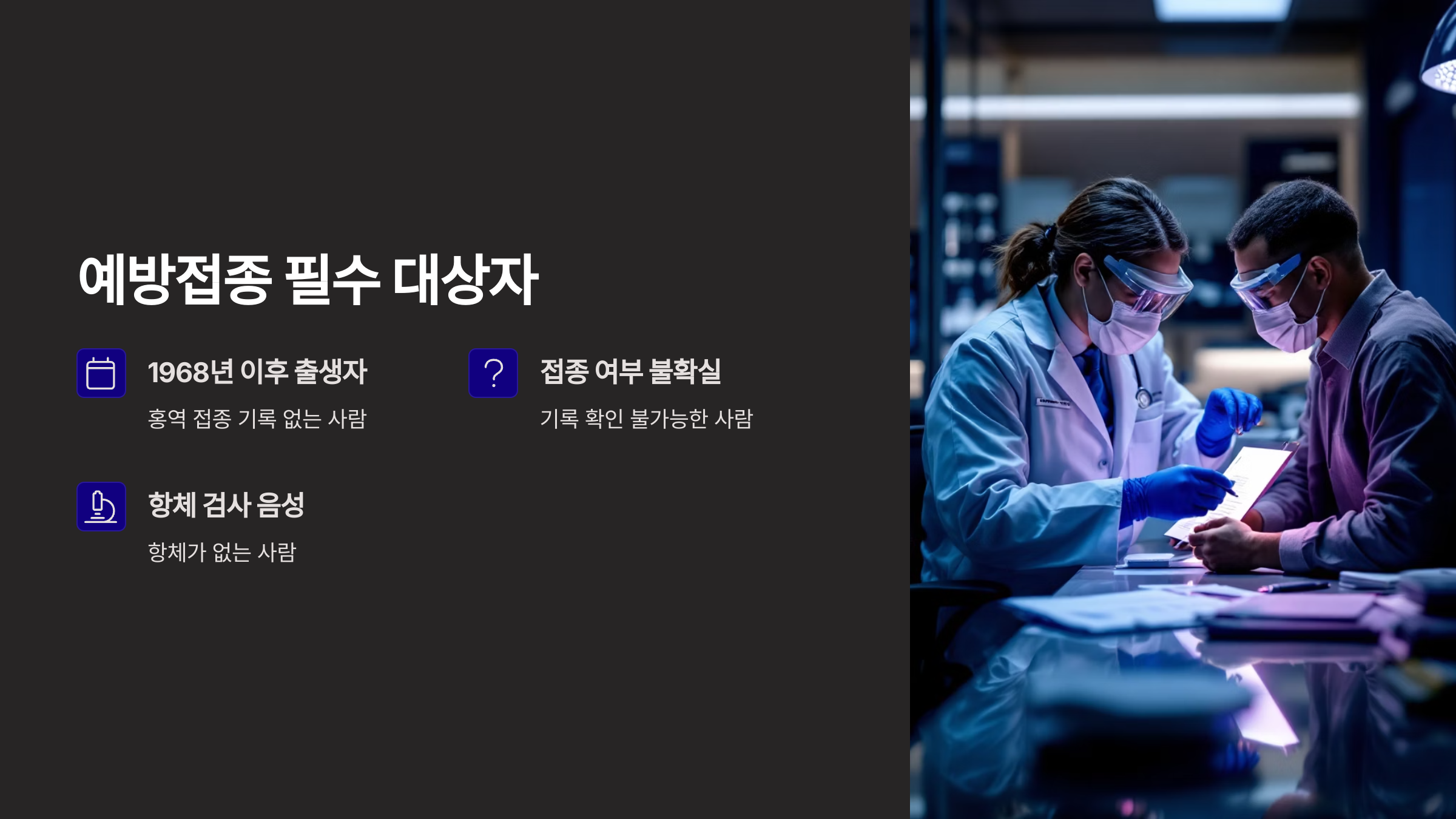 참고로 1967년 이전 출생자는 자연 감염을 통해 항체를 가졌을 가능성이 있지만, 가능성일 뿐이니 항체 검사를 추천해요.