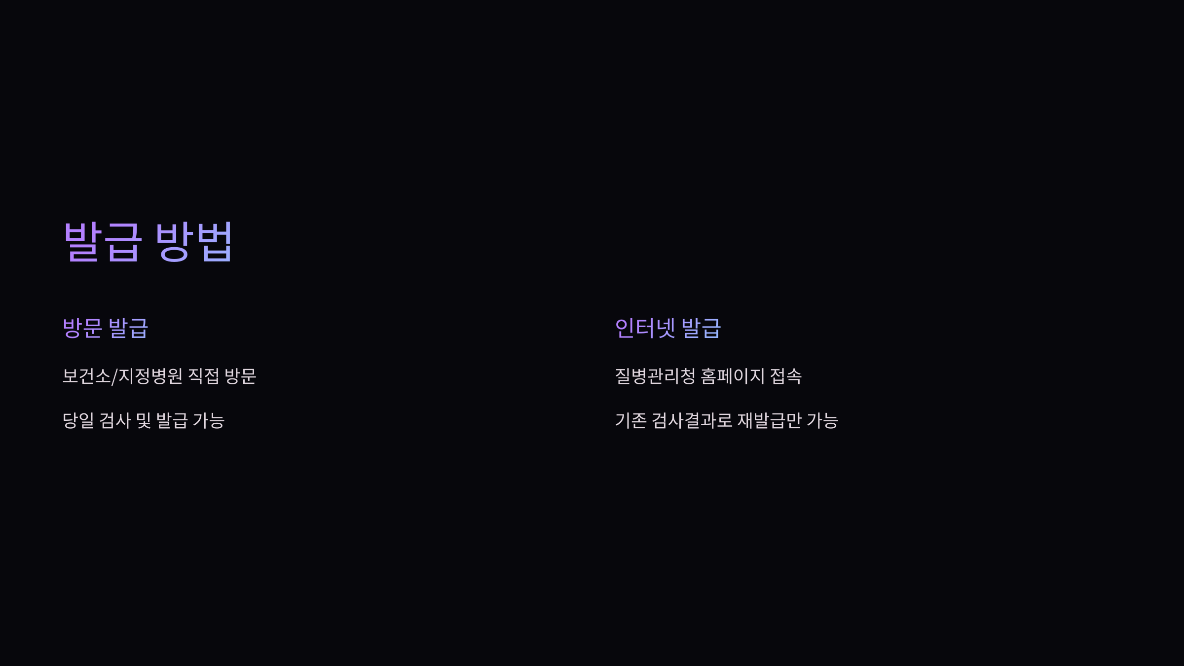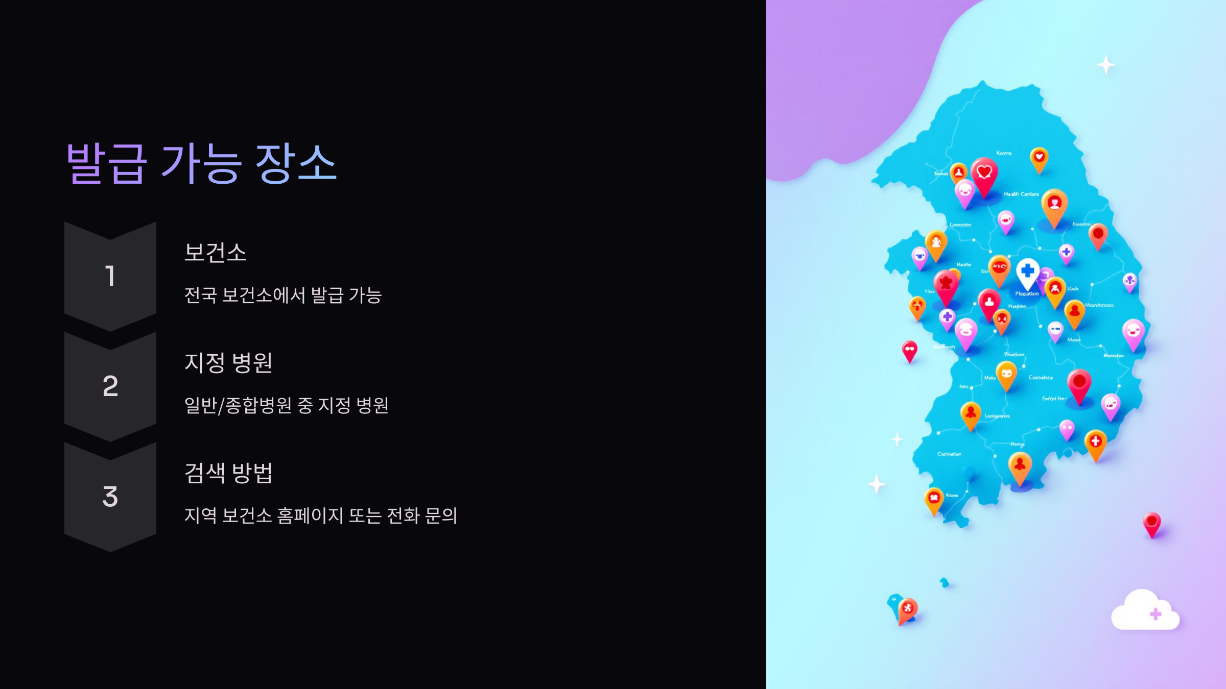 - 전국 보건소에서 발급 가능 (운영 시간: 평일 09:00~18:00, 점심시간 제외)
