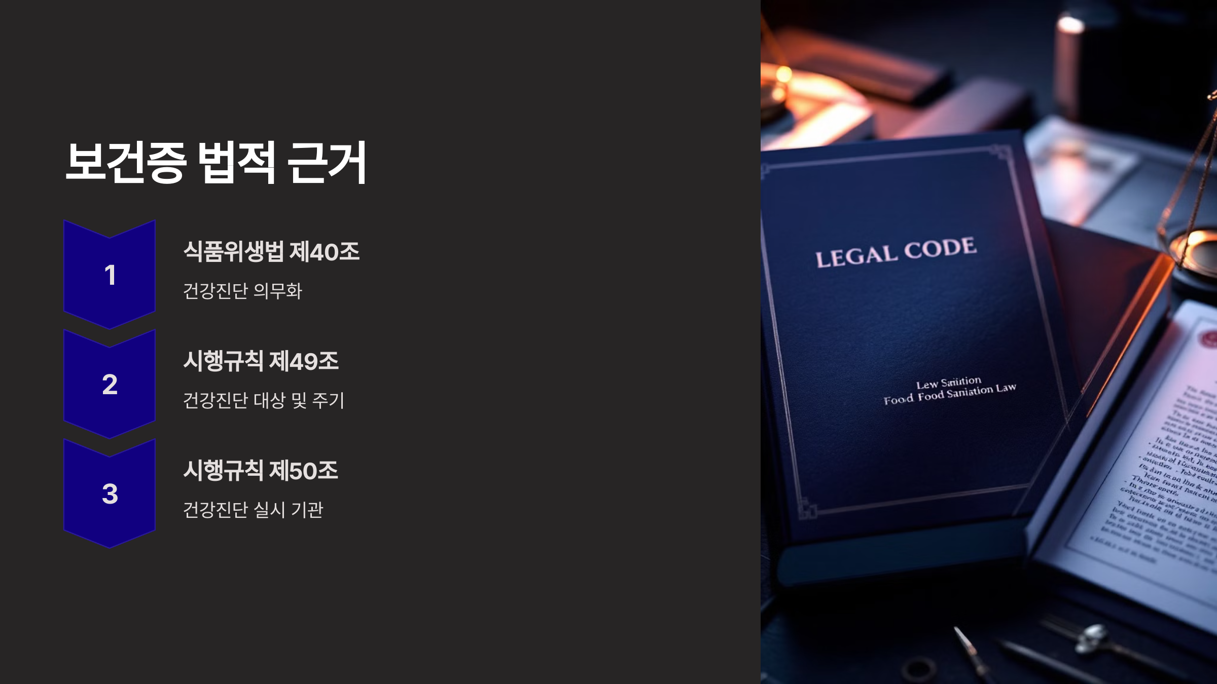 - 📜 식품위생법 제40조: 식품 및 위생 관련 업종 종사자는 정기적으로 건강진단을 받아야 함.
