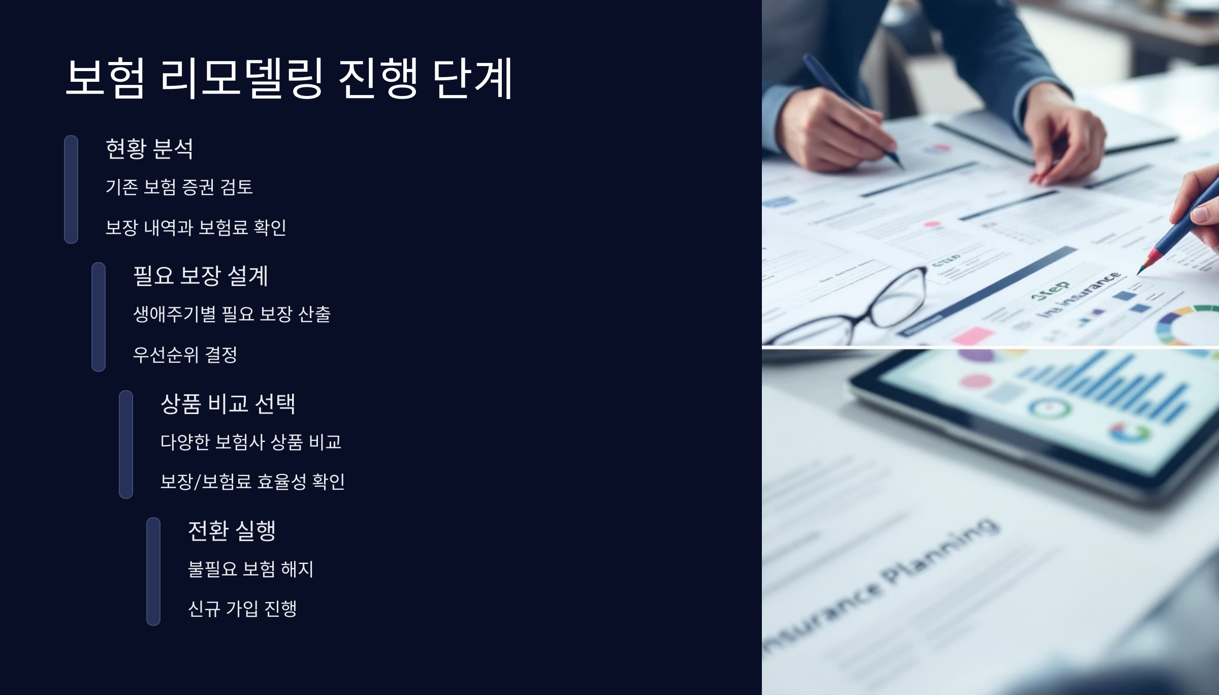 보험 리모델링은 막연하게 시작하면 실패할 수 있어서 단계적으로 진행하는 게 좋아요.