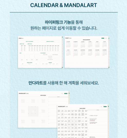 - 내지 구성: 월간/주간 플랜, 만다라트, 프로젝트 매니저, 가계부 페이지 등