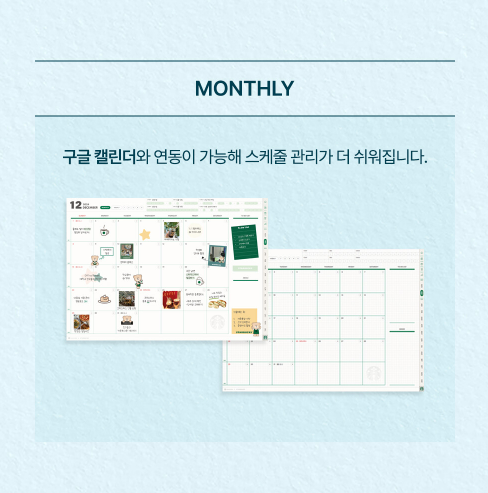 - 월간 계획표: 한 달의 일정을 한눈에 확인할 수 있는 공간