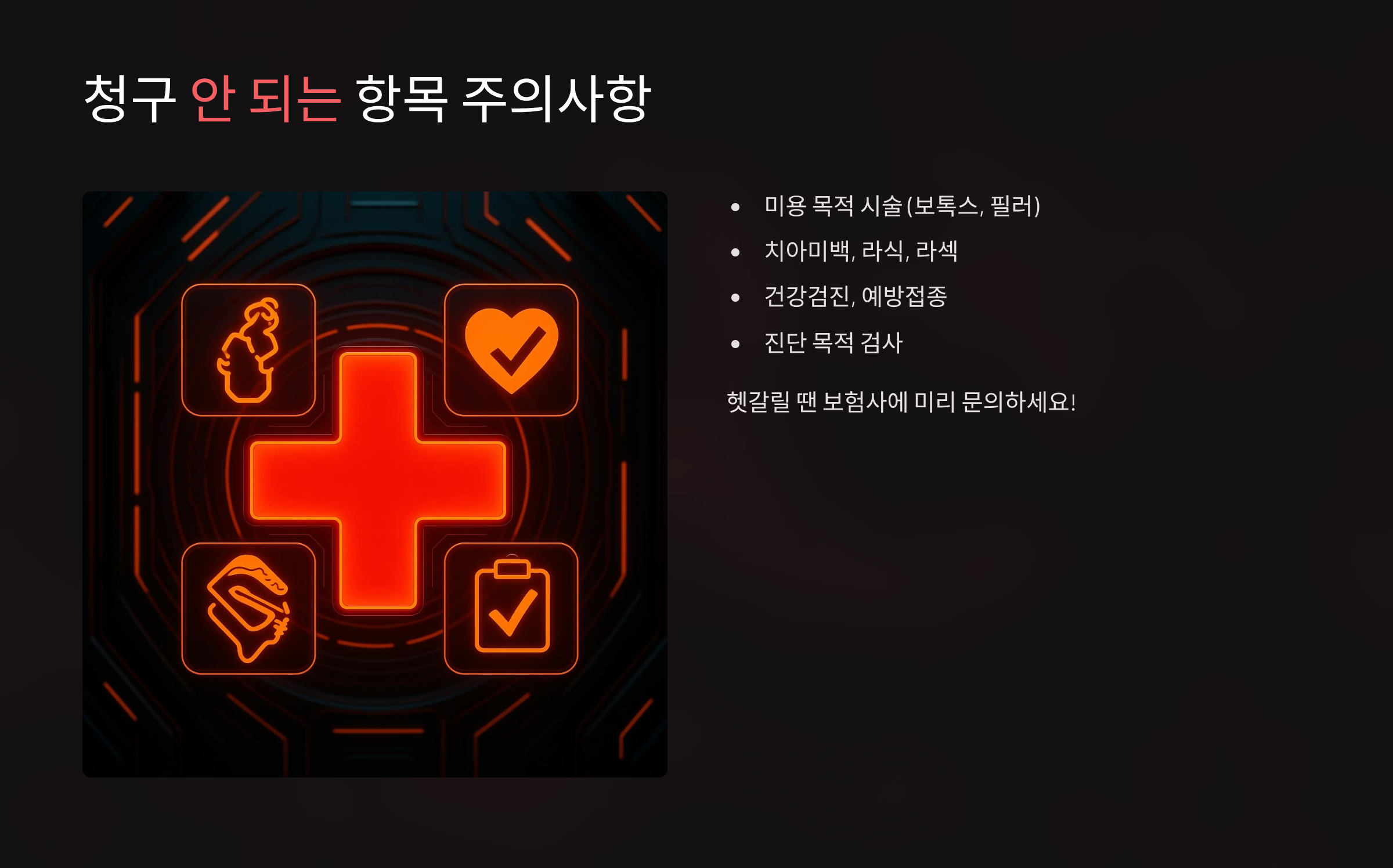대표적으로 미용 목적 시술(보톡스, 필러, 비절개 리프팅 등)은 청구가 안 돼요. 치아미백, 라식, 라섹도 보장 대상이 아니에요.